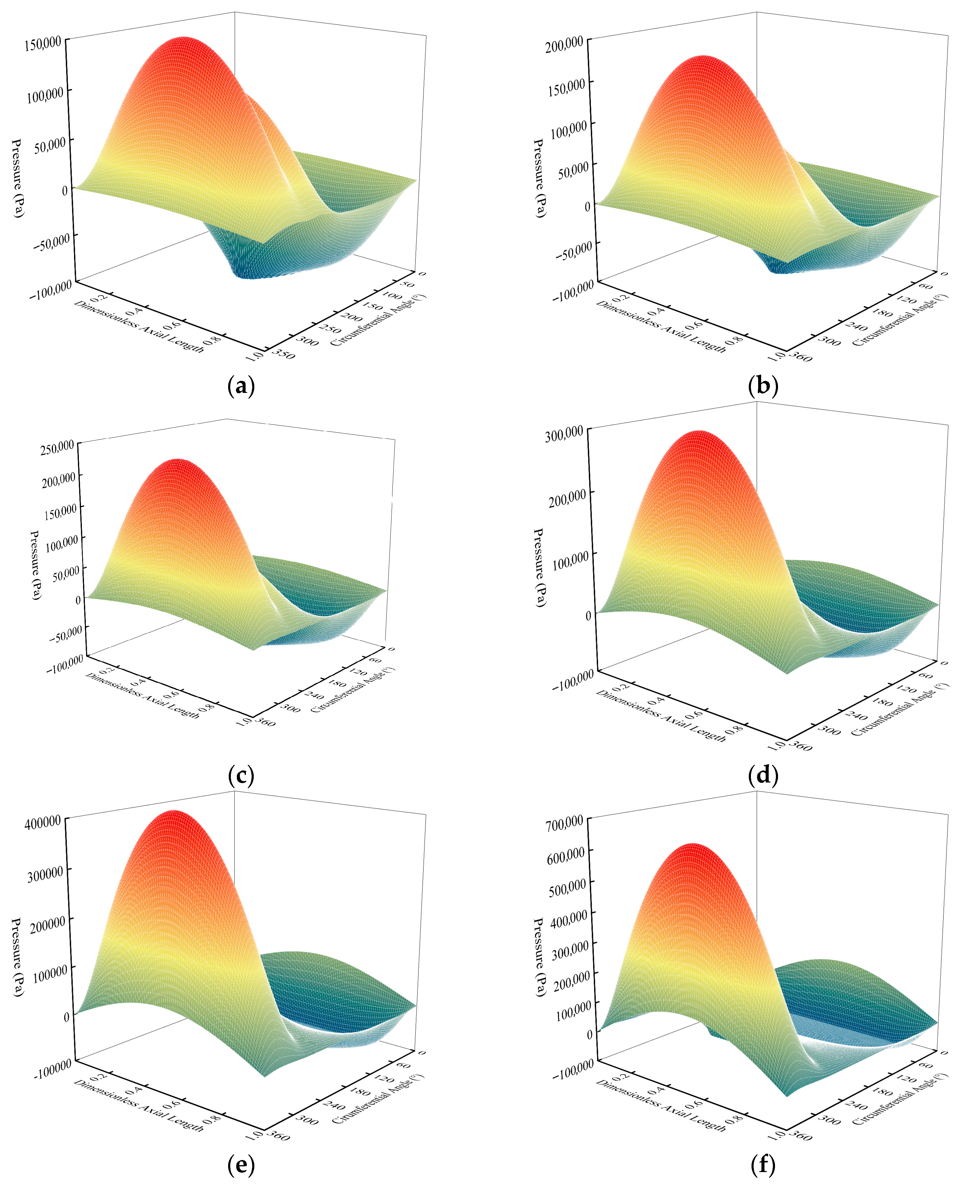 Figure 9 shows the pressure distribution of the oil film under different eccentricities. Due to the presence of the oil supply holes, the continuity of the pressure distribution under ideal conditions is disrupted, causing noticeable fluctuations in the pressure curve in some regions. Due to the constraints of the flow boundary conditions, the negative pressure zone reaches a maximum value of −100,000 Pa.
