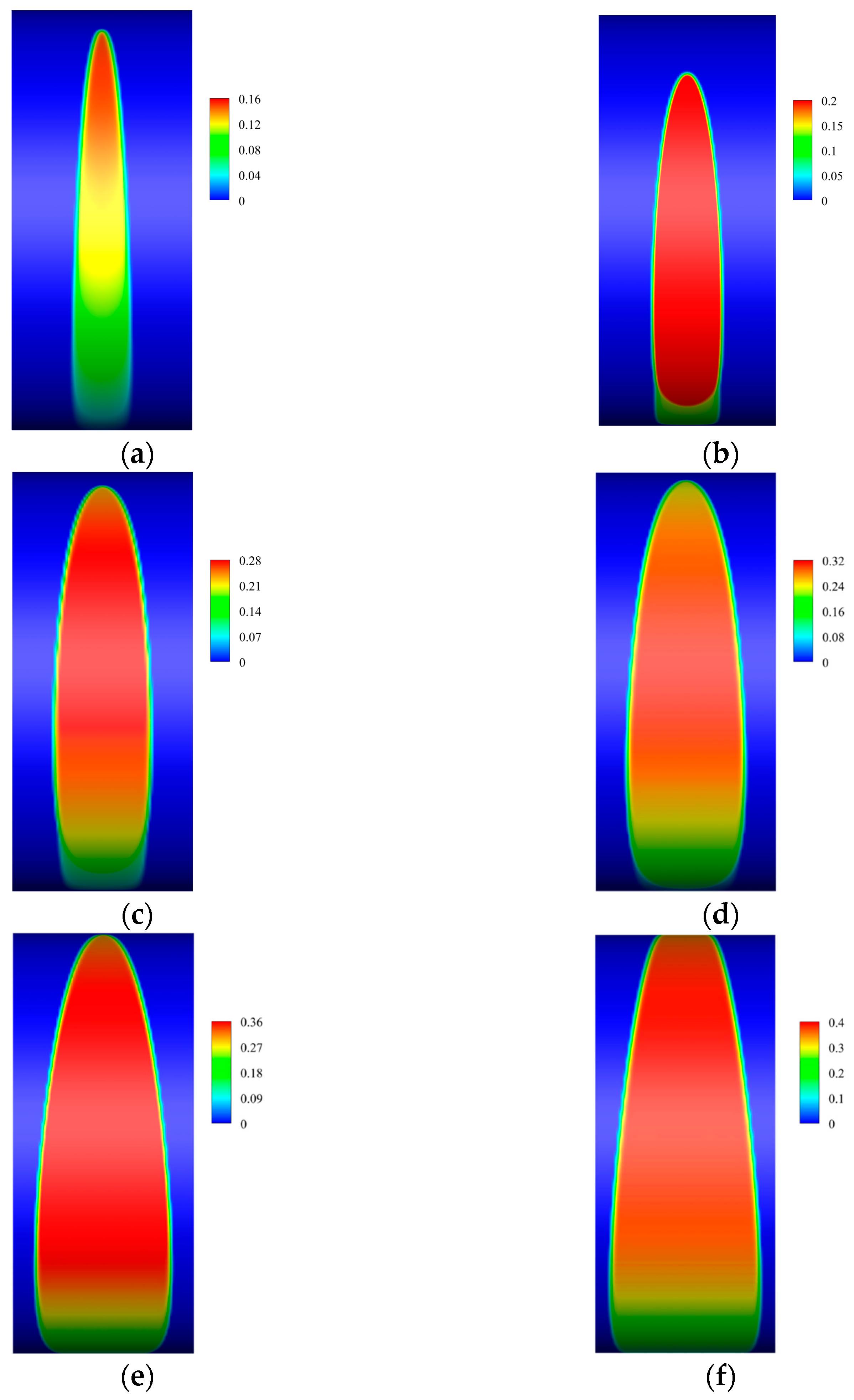 Figure 10 shows the volume ratio of the gas phase in the oil film at different eccentricities. As the eccentricity increases, the amplitude of the oil film pressure increases, the cavitation effect intensifies, and the volume ratio of the gas phase in the oil film increases rapidly. Under conditions with a lower eccentricity, the maximum volume ratio of the gas phase in the oil film is approximately 0.16. However, as the eccentricity continues to increase, the maximum volume ratio of the gas phase gradually rises to 0.4. At the same time, as the eccentricity increases, the uneven distribution of the oil film thickness intensifies. The oil film thickness in certain local areas decreases sharply, and the gas phase range expands rapidly. This is one of the reasons for the reduction in the range of the positive pressure zone.
