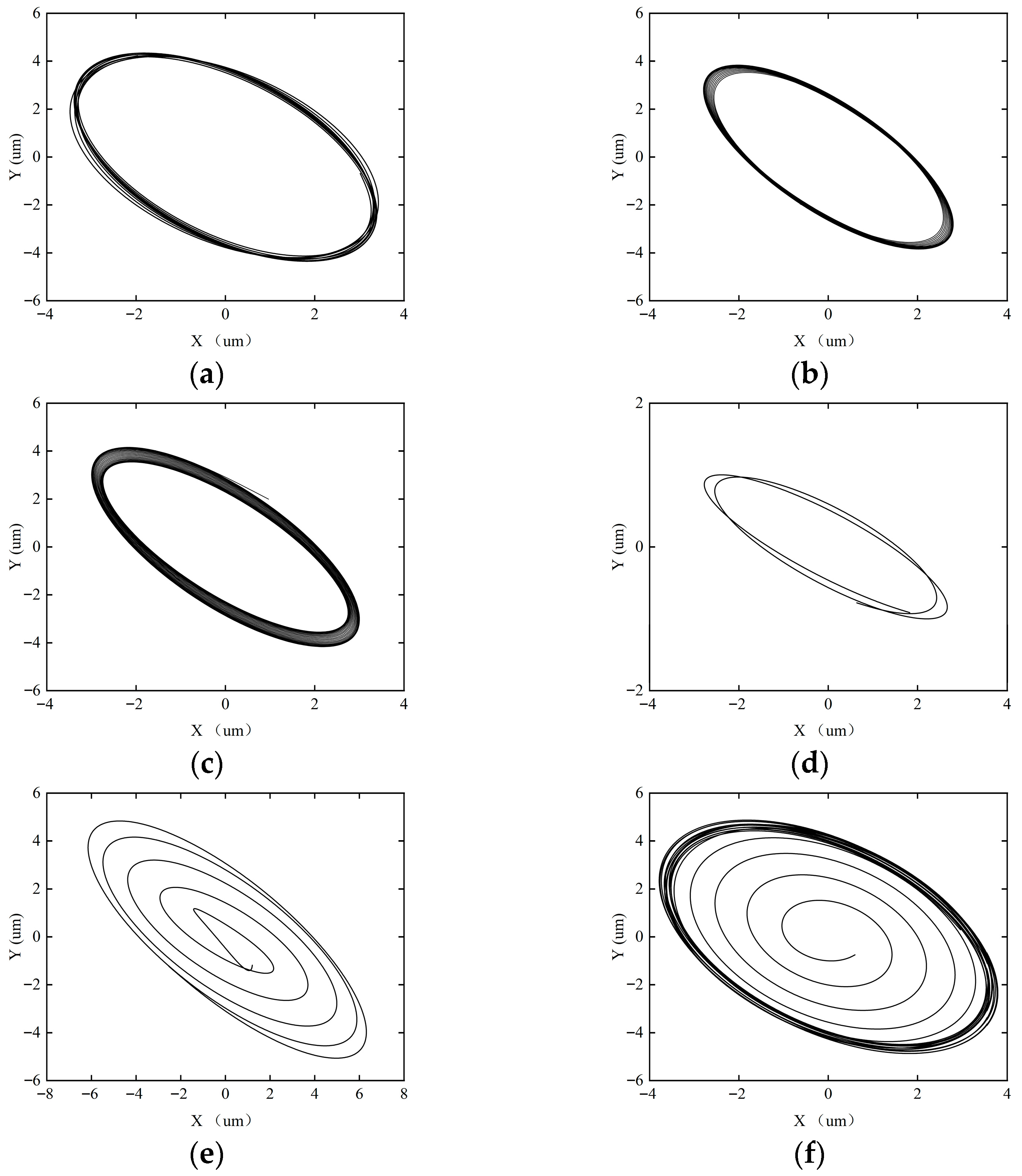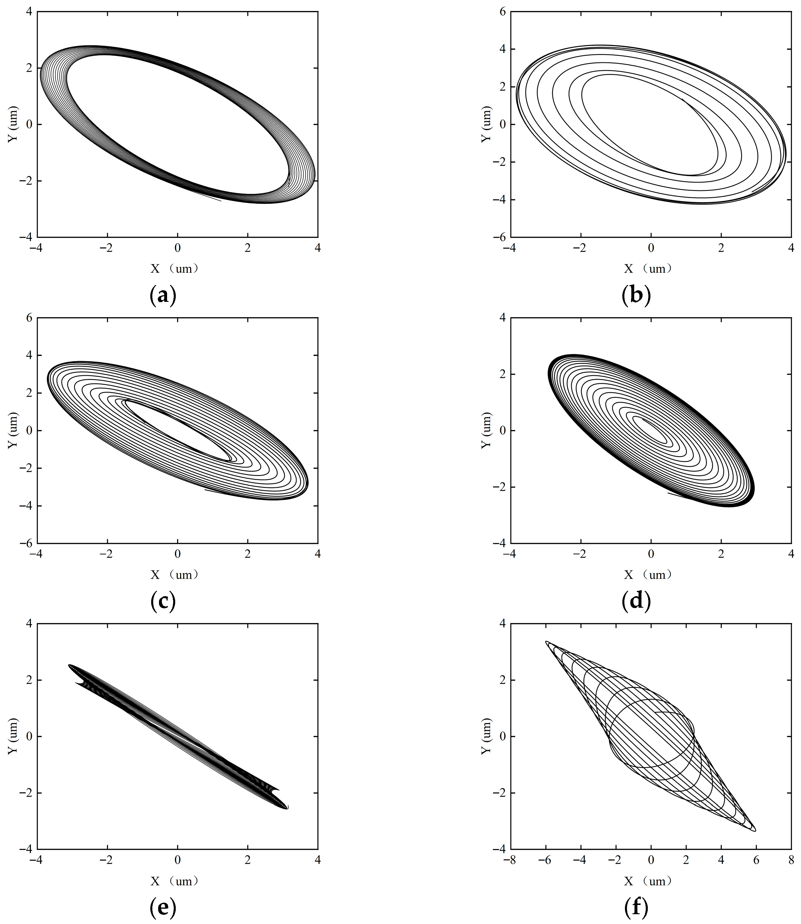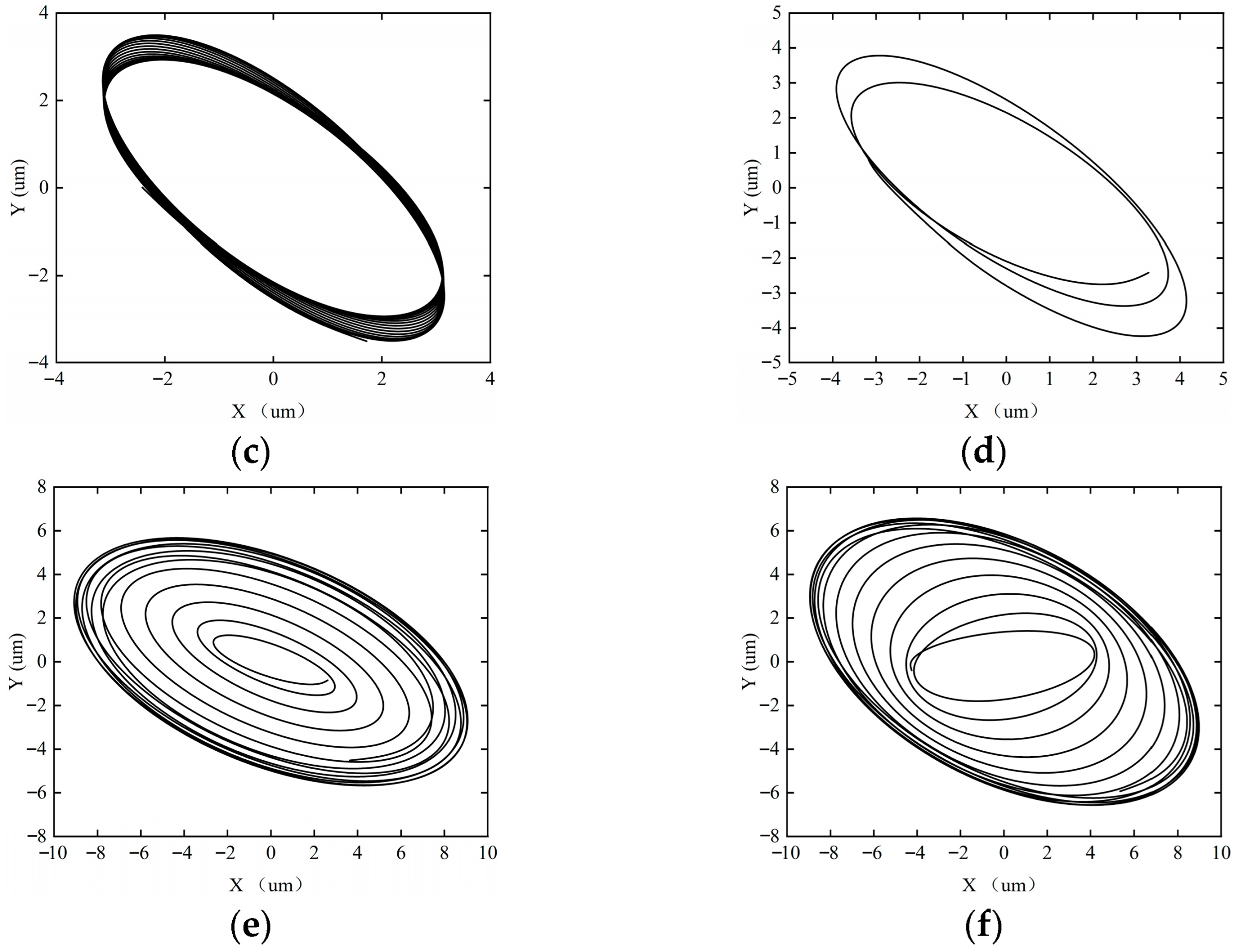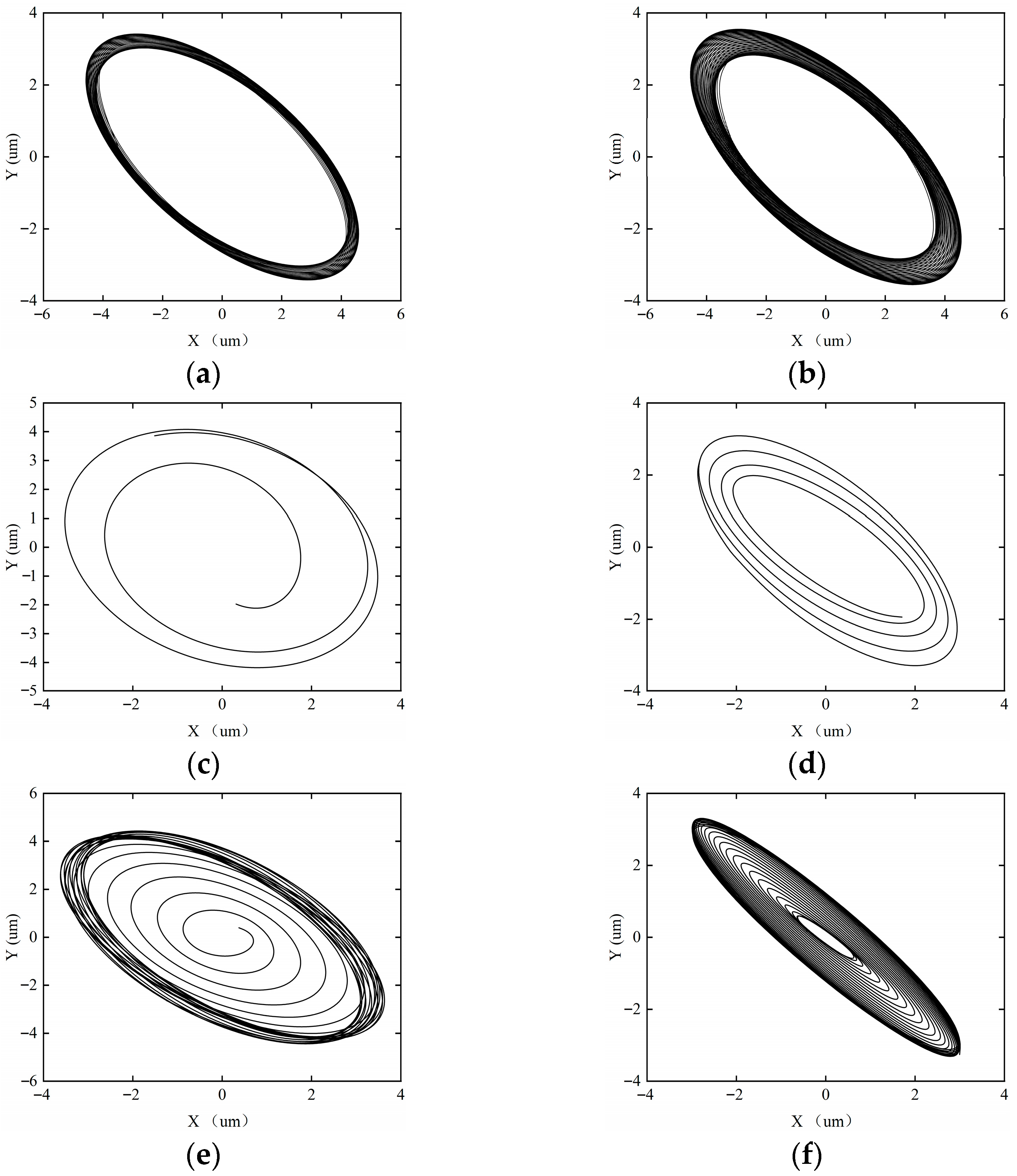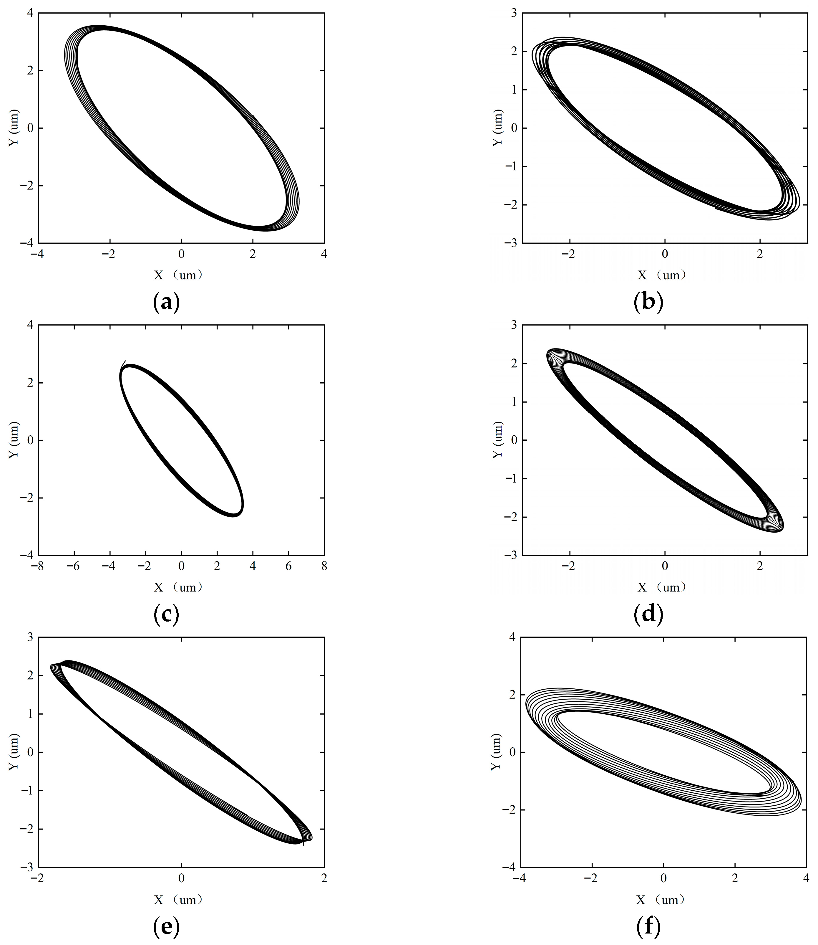 Figure 23 illustrates the shaft center trajectory of the rotor system at T = 80 s. When T = 80 s, the system’s acceleration is relatively large, further enhancing the inertial forces, leading to increased instability of the system. When ω = 12,000 rpm, the system exhibits two circular rings, and the system enters period-2 motion. When ω = 15,000 rpm, the system transitions into quasi-periodic motion. The change in system stability is period-1 motion → period-2 motion → quasi-periodic motion.