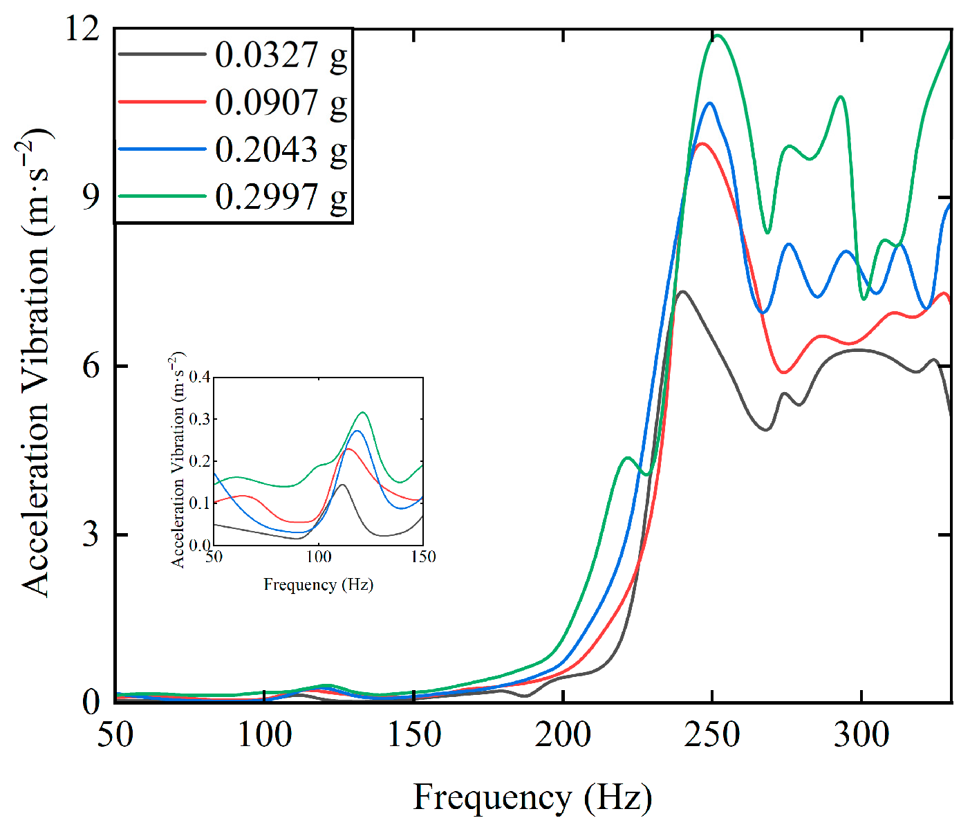 Figure 19 shows the acceleration vibration curves of the rotor system under different imbalance levels. As the imbalance increases, the enhanced centrifugal excitation force and the nonlinear coupling effect with the oil film damping become stronger. That is, the increase in imbalance leads to equivalent stiffness hardening, forcing the system to reach an energy equilibrium state at higher rotational speed ranges. The critical speed threshold shifts to higher precession frequencies, and the critical speed range expands. At the same time, the enhanced centrifugal load strengthens the inertial effects of the oil film, exacerbating the spatiotemporal non-uniformity of the oil film pressure field, and enhancing the cavitation effect. The coupling of multiple physical fields intensifies, leading to an increase in the system’s acceleration vibration amplitude and a decline in system stability.