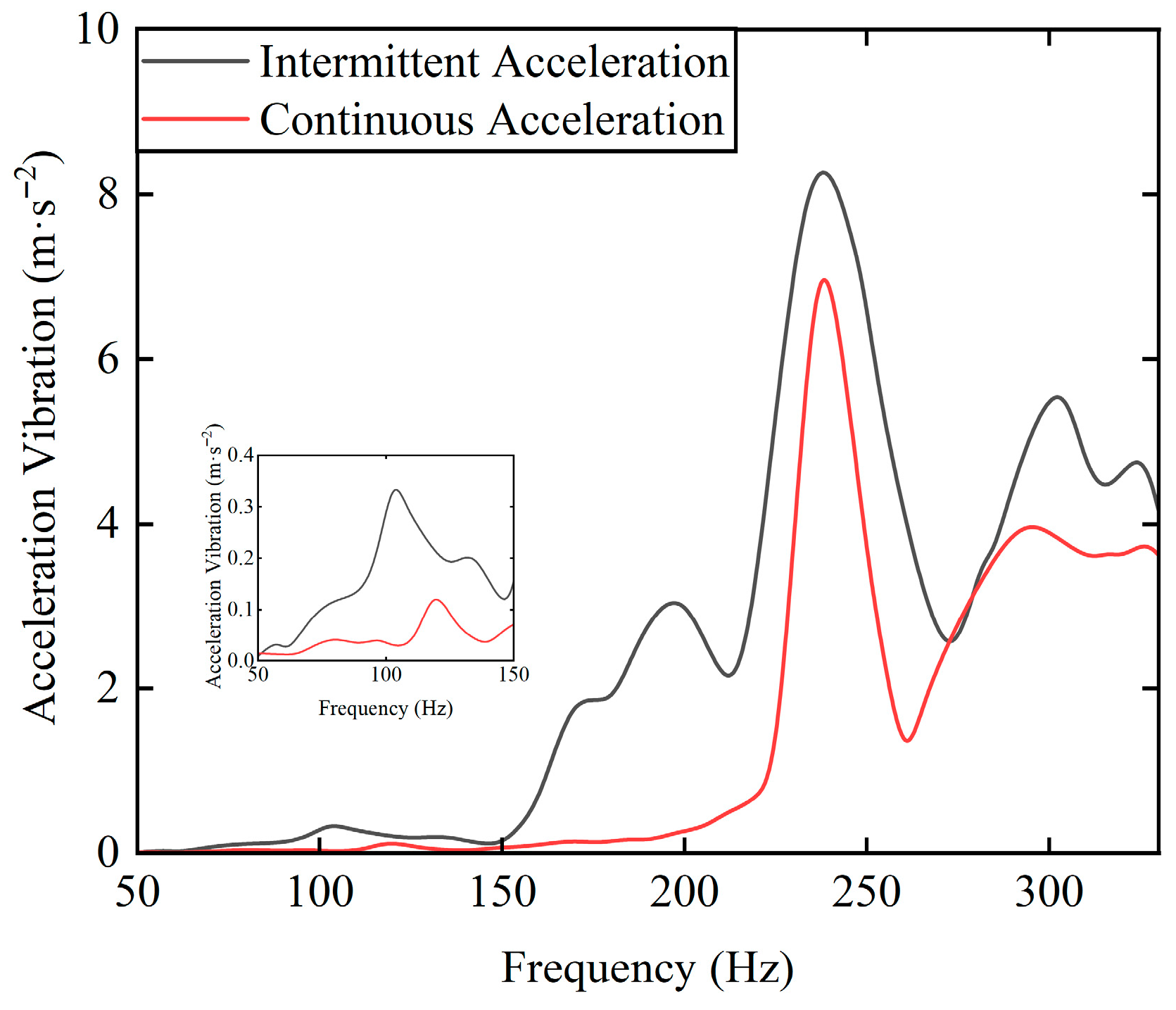 Figure 20 shows the acceleration vibration curves of the rotor–SFD system under intermittent and continuous acceleration. The comparative analysis indicates that under the intermittent acceleration mode, the system experiences different dynamic equilibrium loads during the steady-state operation phase and the acceleration transient phase, resulting in a significant increase in rotor vibration amplitude. The specific manifestations are as follows: (1) The transient impact load during the switching of each speed node leads to a larger vibration amplitude at the discontinuous points compared to the adjacent speed ranges. (2) The steady-state dwell near the critical speed region (such as the 15,000 rpm node) causes sustained resonance between the external excitation and the rotor’s natural frequency, resulting in continuous energy accumulation, which increases the amplitude in the critical region compared to the continuous acceleration mode. (3) The re-acceleration process after steady-state operation in the high-speed domain (18,000 rpm) shows a cumulative increase in vibration amplitude due to the coupling effects of fluid inertia and cavitation.