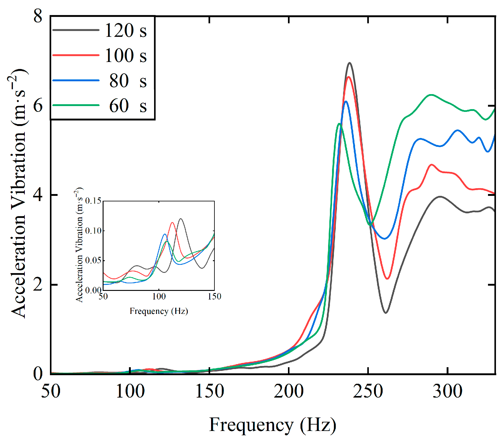 In order to study the effect of acceleration on the dynamic characteristics of the rotor–SFD system, dynamic characteristic tests of the rotor–SFD system were conducted with acceleration times of T = 120, 100, 80, and 60 s.