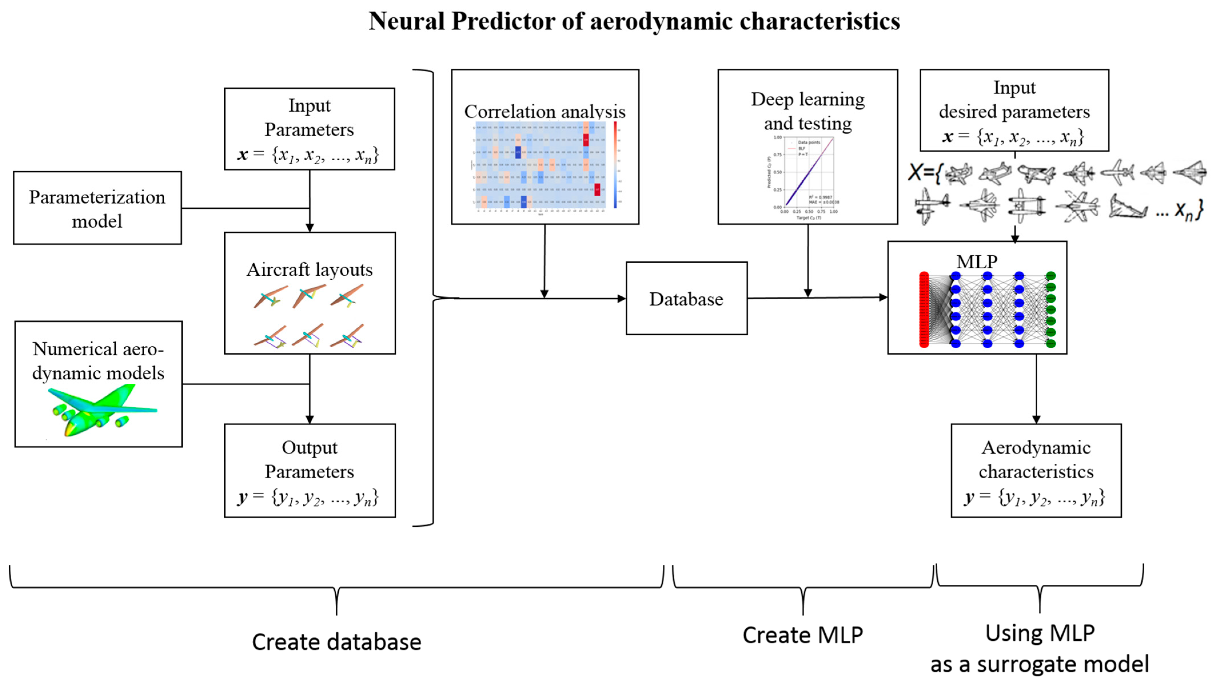 | Main features | Our neural network utilizes 23 input parameters and 7 output parameters. Of the 23 input parameters, 20 define the aircraft geometry and 3 define flow characteristics. At the time this work was written, this is the only neural network capable of predicting 7 different aerodynamic coefficients. This work considers fixed-wing aircraft configurations with two lifting surfaces. The aerodynamic coefficients predicted by the neural network are considered for an inviscid, incompressible, and subsonic flow. | The neural network implements 22 input parameters and 3 output parameters. The input parameters are: 16 that define the geometry of the wing and tail, 2 that define the fuselage geometry, 3 for the center of gravity position, and one for the angle of attack. The aircraft configuration type corresponds to SMALL UAVs. Only one flight regime was considered (a single value of Re and M). | The authors created a neural network to predict each aerodynamic coefficient. Each MLP considers 40 input parameters and 1 output parameter. Of the input parameters, 10 define the wing configuration, 27 define the geometry of the root, tip, and kink airfoils, and 3 define the flow conditions. This work is limited to predicting the aerodynamic coefficients of wing configurations used in transport aircraft. Subsonic and transonic flows are considered. | The CNN created by the authors has the distinctive feature of handling 1-D tensors. The neural network considers 109 input parameters and 3 output parameters. Of the input parameters, 7 define the wing configuration composed of 5 stations, 100 parameters define the geometry of the airfoils at each station, and 2 define the flow conditions. This work is limited to a flying wing configuration for hypersonic air vehicles. Only hypersonic flows are considered. | |