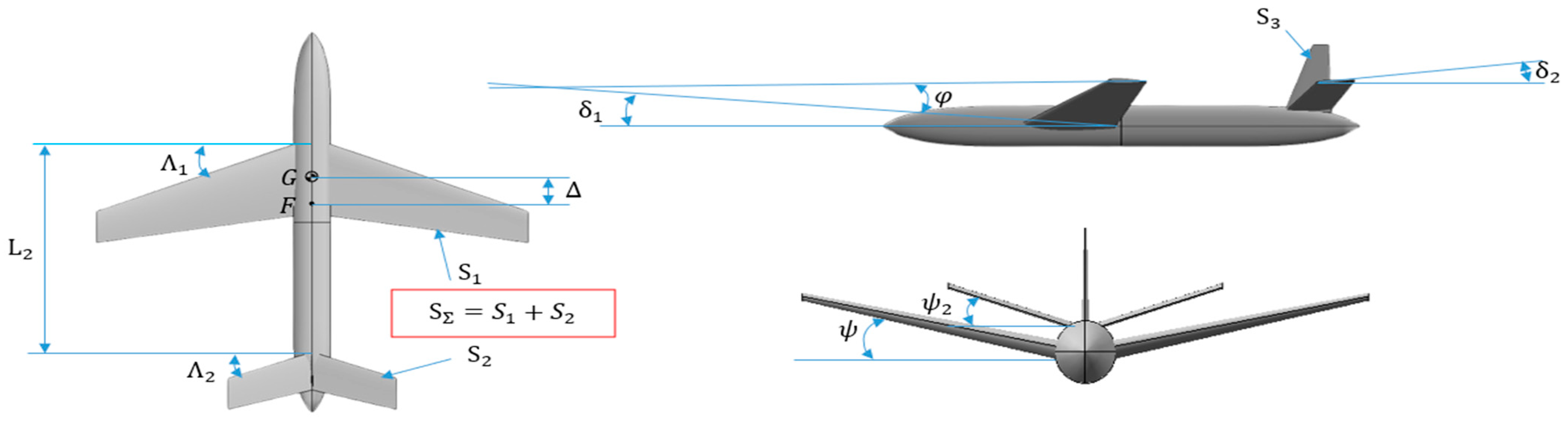 | 6 | Sweep of the aftward wing Λ2, [°] | −45.0 | 45.0 |