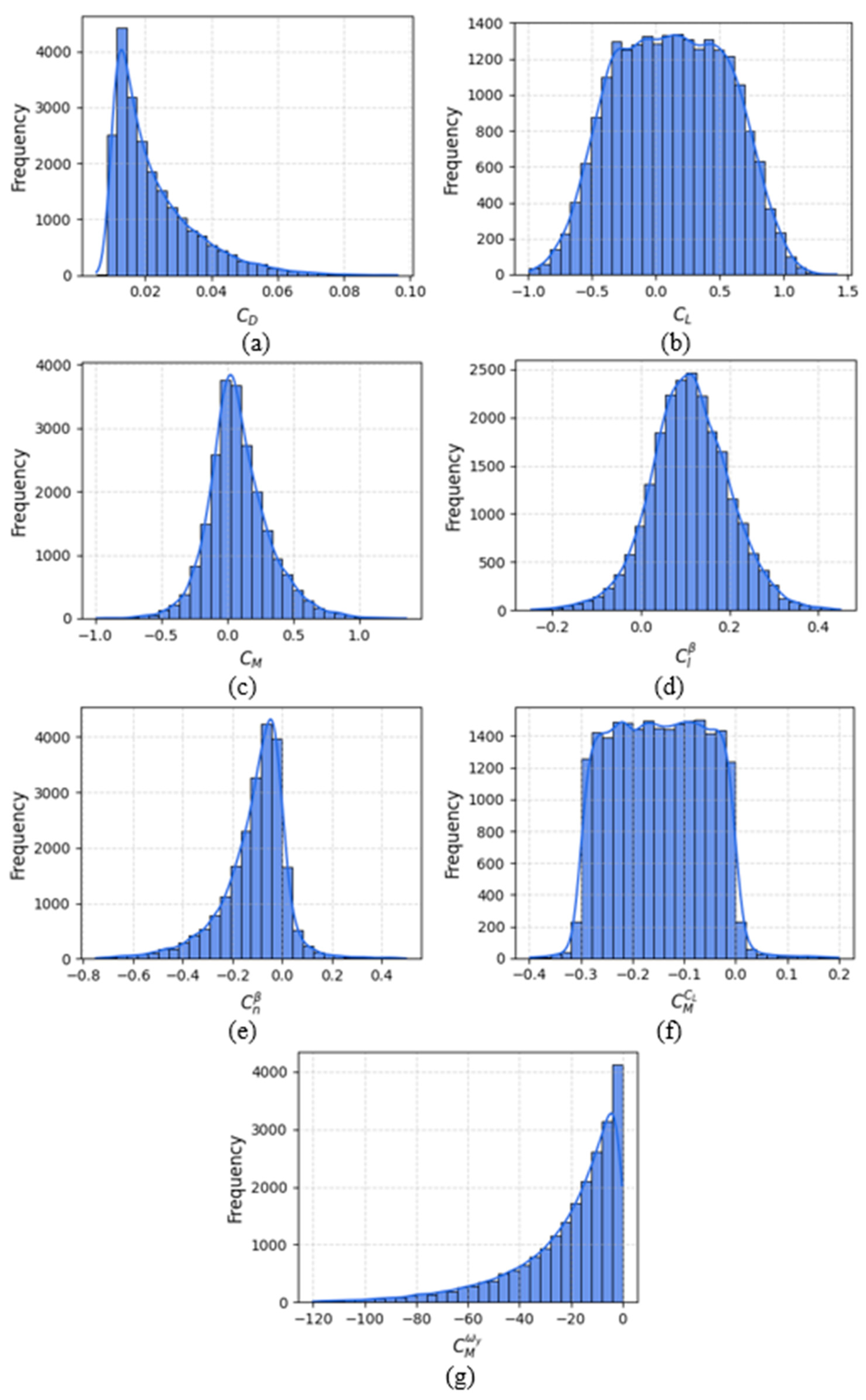 - From the initial dataset consisting of 28,000 individuals, 849 cases with unsuccessful combinations of geometric parameters leading to poor aerodynamic characteristics were excluded, leaving a database with 27,151 individuals. Figure 5 presents the frequency distribution histograms of aerodynamic characteristics across individuals after this filtering step;