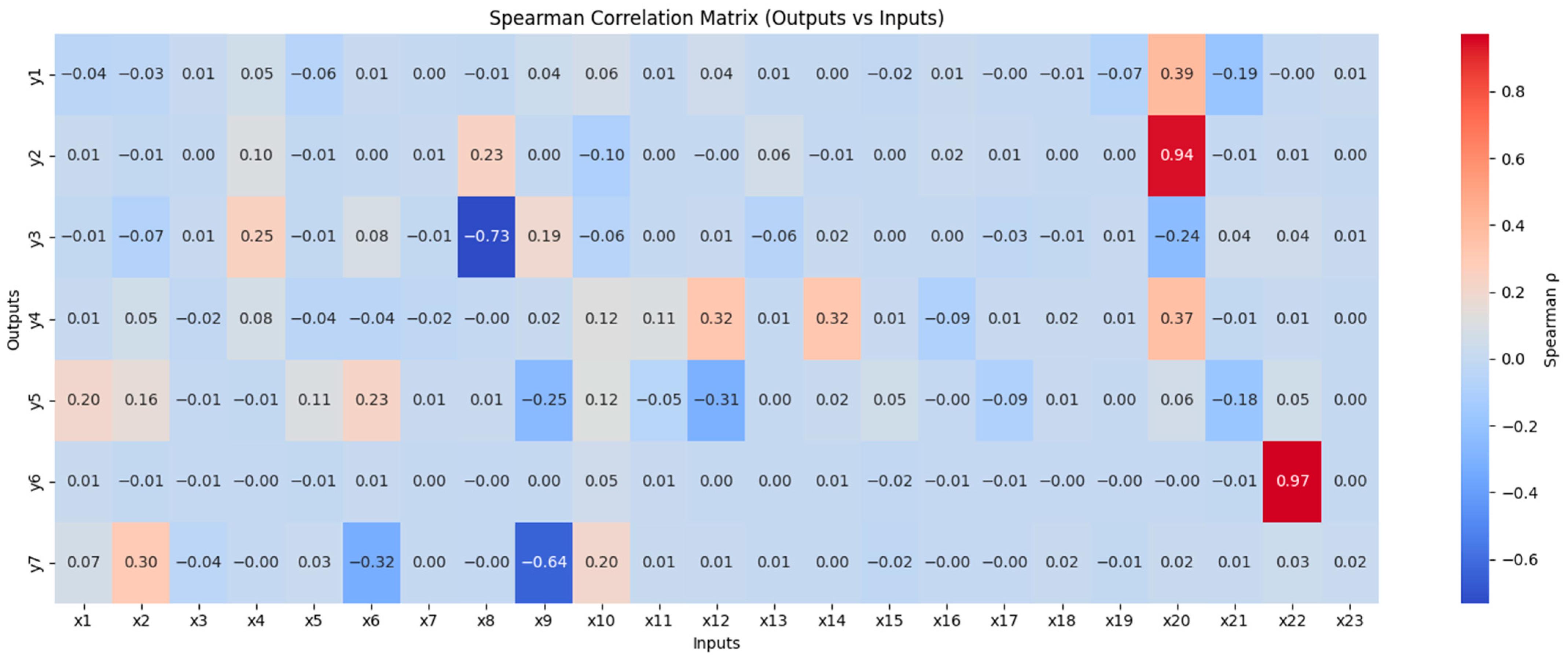 - A strong correlation between the input and output data must ensure the accurate training of the neural network. This is particularly important for the inverse model in which the input variables are selected to achieve the prescribed output characteristics. The Spearman’s correlation coefficient [33,34] was employed for the dataset correlation analysis, which is defined as follows: