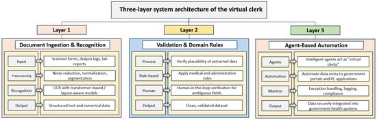 The intelligent virtual clerk was developed as an add-on module to the NephroM system, an enterprise resource platform (ERP) used for managing dialysis operations and patient data. Rather than replacing existing infrastructure, the module extends NephroM’s capabilities by introducing an agent-based automation layer that interfaces with external government portals such as the National Health Security Office (NHSO) and the Health Service Information Office. This integration enables automated data exchange while maintaining compliance with security and interoperability requirements. The intelligent virtual clerk is organized into a three-layer system architecture that was fully implemented in the working prototype, as illustrated in Figure 1. The first layer, Document Ingestion and Recognition, processes inputs from scanned forms, dialysis logs, and laboratory reports through preprocessing methods such as noise reduction, normalization, and segmentation, followed by optical character recognition using layout-aware models to generate structured data. The second layer, Validation and Domain Rules, ensures that extracted values are clinically plausible and consistent with administrative standards by applying predefined rules and allowing human-in-the-loop verification for ambiguous cases. The third layer, Agent-Based Automation, was also developed and deployed within the prototype. It functions as the operational core of the virtual clerk, where intelligent agents automatically interact with government platforms, handle exceptions, and ensure compliance through automated logging and monitoring. Functional testing confirmed that the automation agents can execute submission and verification tasks reliably across both web-based and desktop systems.