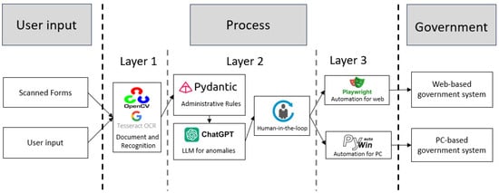 In order to provide project-specific details, the technical implementation of this architecture is further illustrated in Figure 2, which maps the tools and APIs applied to each system layer. In the input stage, scanned forms are processed using OpenCV and Tesseract OCR, while structured digital entries are collected directly from user inputs. In Layer 2, Pydantic is employed to enforce administrative and clinical validation rules, while ChatGPT (GPT-4 API, 1 March 2025) supports anomaly detection and explanatory reasoning, complemented by human verification where necessary. In Layer 3, the automation framework integrates Playwright for web-based workflows and PyWinAuto for PC-based government systems. Both were configured and tested to perform automated data entry, submission, and report generation, ensuring adaptability and compliance across heterogeneous integration environments. This implementation demonstrates the practical application of the virtual clerk in a real-world project, emphasizing its modularity and showing how open-source libraries, LLM reasoning, and agent-based automation can be integrated into a workflow that directly addresses the lack of interoperable APIs in government health information systems.