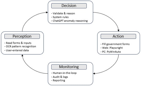 The action stage enables the agent to simulate the role of a clerk by automatically filling government forms and submitting records through existing platforms. Web-based portals are handled with Playwright, while legacy PC applications are managed with PyWinAuto, ensuring flexibility across heterogeneous infrastructures. Finally, the monitoring stage incorporates human-in-the-loop validation, systematic audit logging, and reporting, which provide transparency, error recovery, and compliance with security requirements. Collectively, these four stages form a closed-loop cycle that allows the agent to perceive its environment, reason over data, act autonomously, and adapt based on feedback.