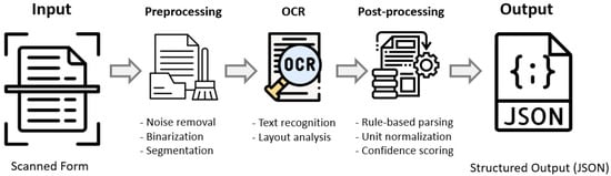 This section describes the image-processing pipeline that converts printed paper forms and scanned dialysis logs into machine-readable data ready for validation and automation. An overview of the pipeline is shown in Figure 4. Preprocessing begins with denoising, de-skewing, and contrast normalization, followed by binarization to improve text–background separation. Global thresholding [26] and adaptive binarization methods [27] are applied depending on illumination and paper artifacts, with morphological operations used to repair broken strokes and suppress speckle noise. Text regions are localized and recognized using the Tesseract OCR engine, which employs adaptive classifiers and language models to support robust character recognition in printed clinical forms [28]. For semi-structured layouts such as tables, labels, and key–value zones, the pipeline aligns OCR results with layout-aware models to preserve spatial relationships, thereby enabling reliable field mapping across variable templates [13,15].