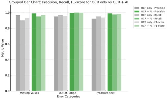 The evaluation was performed on 65 documents, each containing approximately 35 data fields, totaling 2275 fields for error detection analysis. The comparison between the basic OCR system and the AI-enhanced OCR system demonstrated clear improvements in error detection performance across all three error categories, as presented in Table 1 and Figure 7. For Missing Values, the AI-enhanced OCR achieved a precision of 0.990, recall of 0.950, and F1-score of 0.969, all higher than those of the basic OCR system (precision 0.968, recall 0.900, F1-score 0.933). In the Out-of-Range category, the AI-enhanced OCR showed the greatest improvement with near-perfect recall (0.999) and precision (0.995), yielding an F1-score of 0.997, compared to the basic OCR system’s precision of 0.951, recall of 0.967, and F1-score of 0.959. Similarly, for Typo/Free-text errors, the AI-enhanced OCR reached a precision of 0.990, recall of 0.977, and F1-score of 0.983, outperforming the basic OCR’s precision of 0.922, recall of 0.950, and F1-score of 0.936. As shown in the grouped bar chart, the AI-enhanced OCR consistently achieved higher precision, recall, and F1-scores across all error categories, with the most notable improvement observed in Out-of-Range errors. These results indicate that the integration of AI with traditional OCR significantly enhances automation accuracy and reduces manual verification needs, particularly when handling complex or ambiguous data fields.