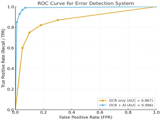 ROC curve comparing error detection performance of basic OCR and AI-enhanced OCR systems.