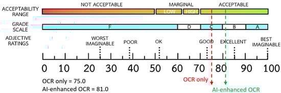 User acceptance and usability were assessed using the System Usability Scale (SUS) [33], a standardized instrument consisting of ten items with alternating positive and negative statements rated on a five-point Likert scale. Each participant used both the basic OCR system and the AI-enhanced OCR system and completed the SUS questionnaire for each configuration after task completion. For each configuration, the mean SUS score and standard deviation were calculated on a 0–100 scale, where higher scores indicate better usability. These scores were interpreted against conventional benchmarks [34], with scores below 50 categorized as Not Acceptable, scores between 50 and 70 as Marginal, and scores above 70 as Acceptable, including the sub-ranges of Good (70–80) and Excellent (>80). The results were visualized using an acceptability scale diagram to highlight the usability difference between the two systems.