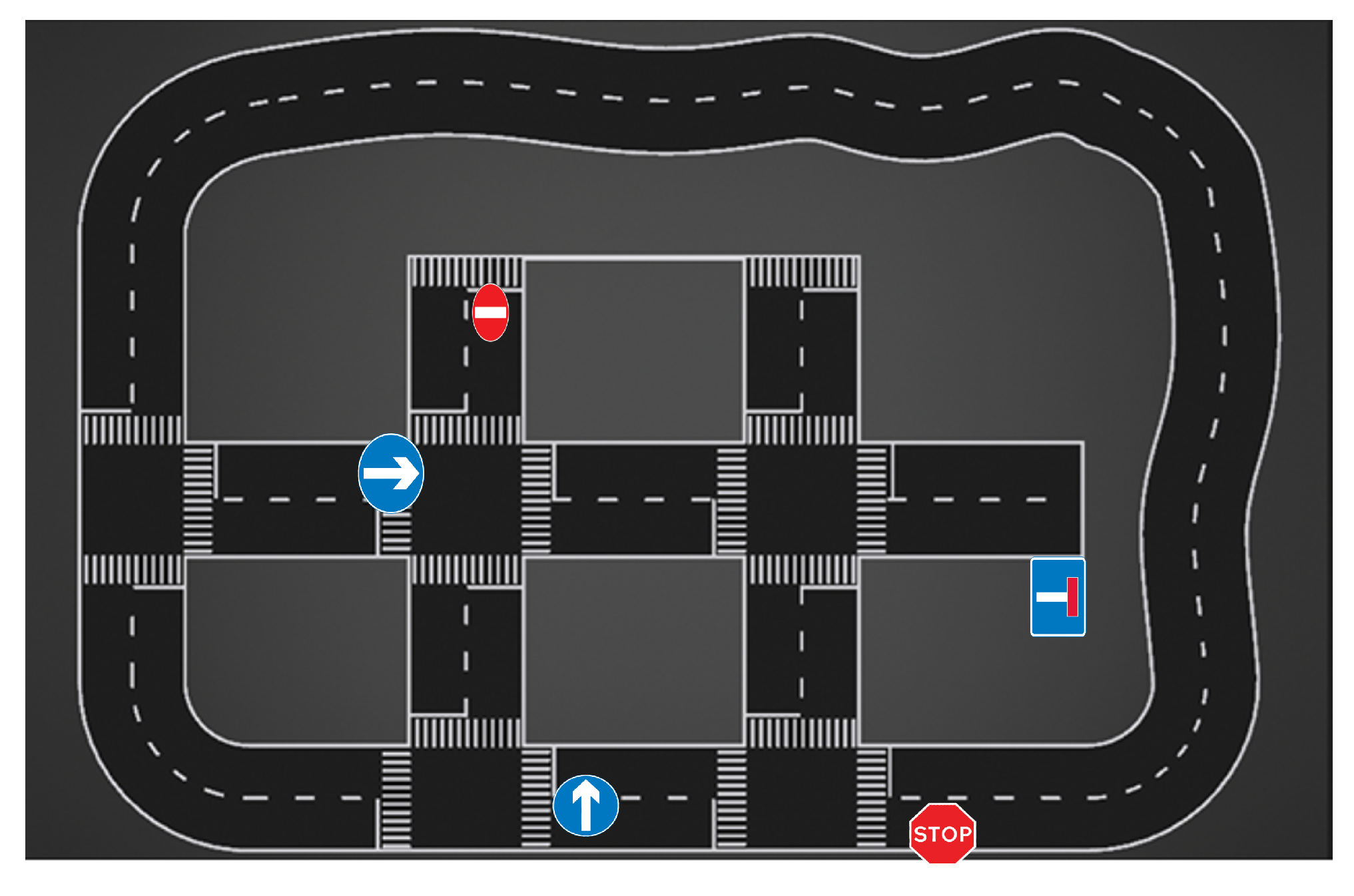 Track layout used for data collection. Traffic signs were positioned at key intersections and corners. The environment simulates a reduced-scale urban driving scenario with realistic perception conditions.
