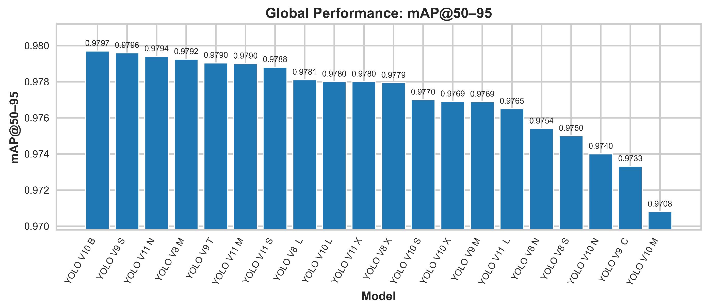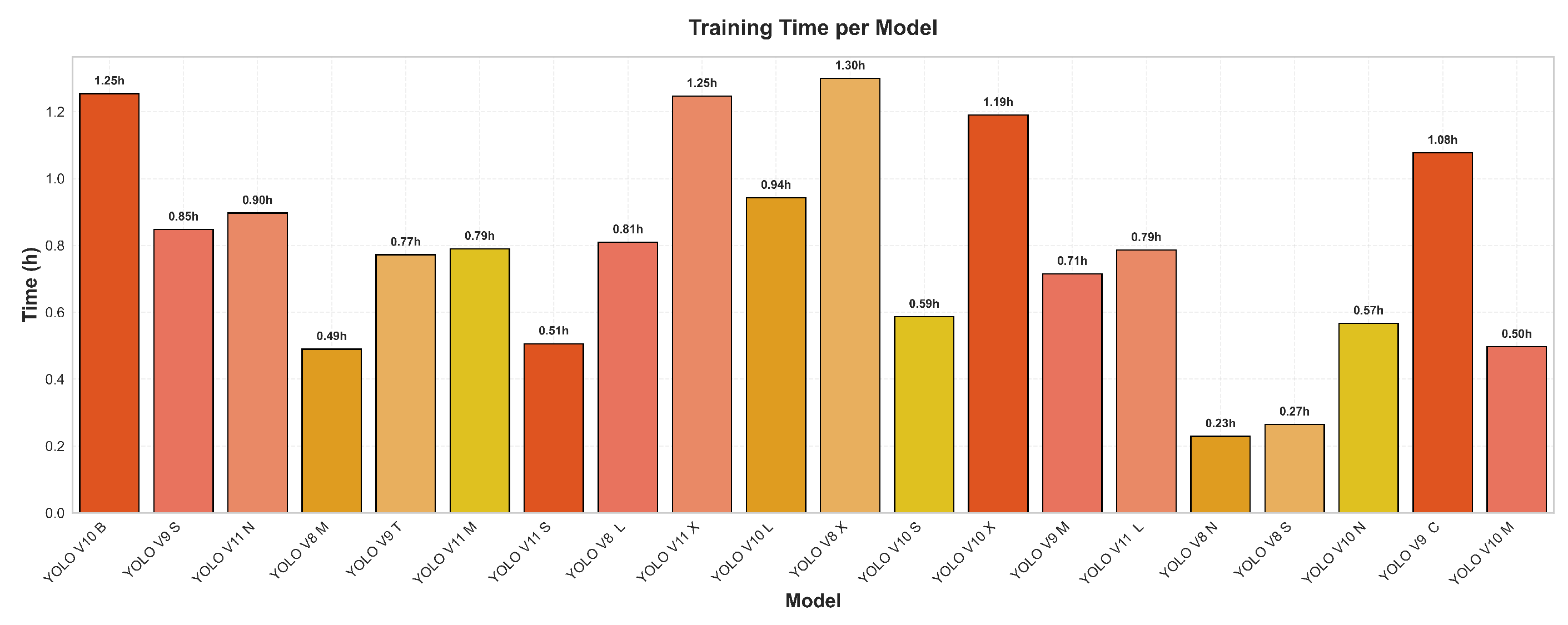Total training time required for each YOLO version under identical experimental conditions. Lightweight models (YOLOv8N, YOLOv10N) complete training in less than one hour, whereas high-capacity models (YOLOv8X, YOLOv10B) exceed 1.2 h. This contrast reflects the computational trade-off between scalability and training efficiency.