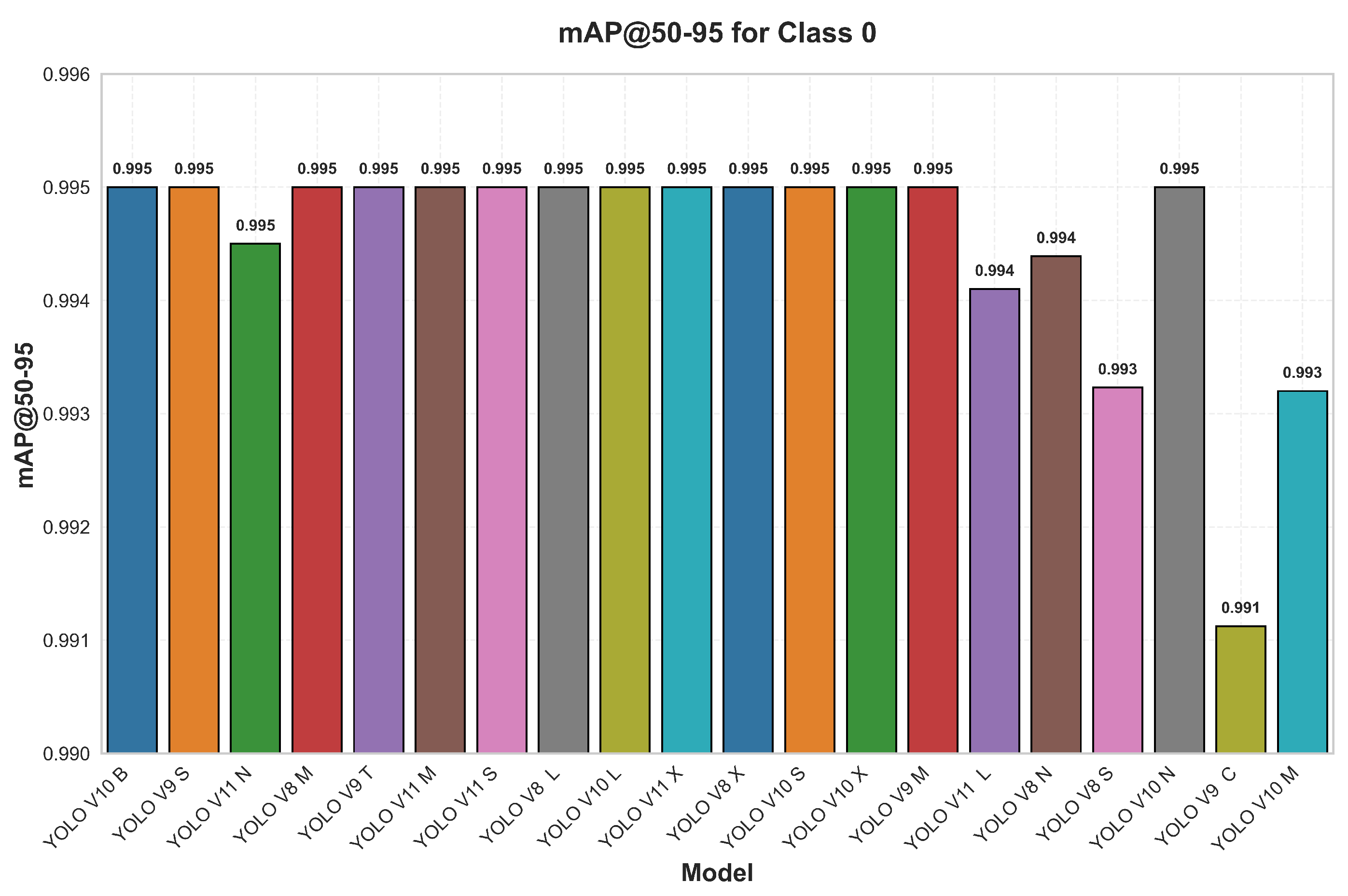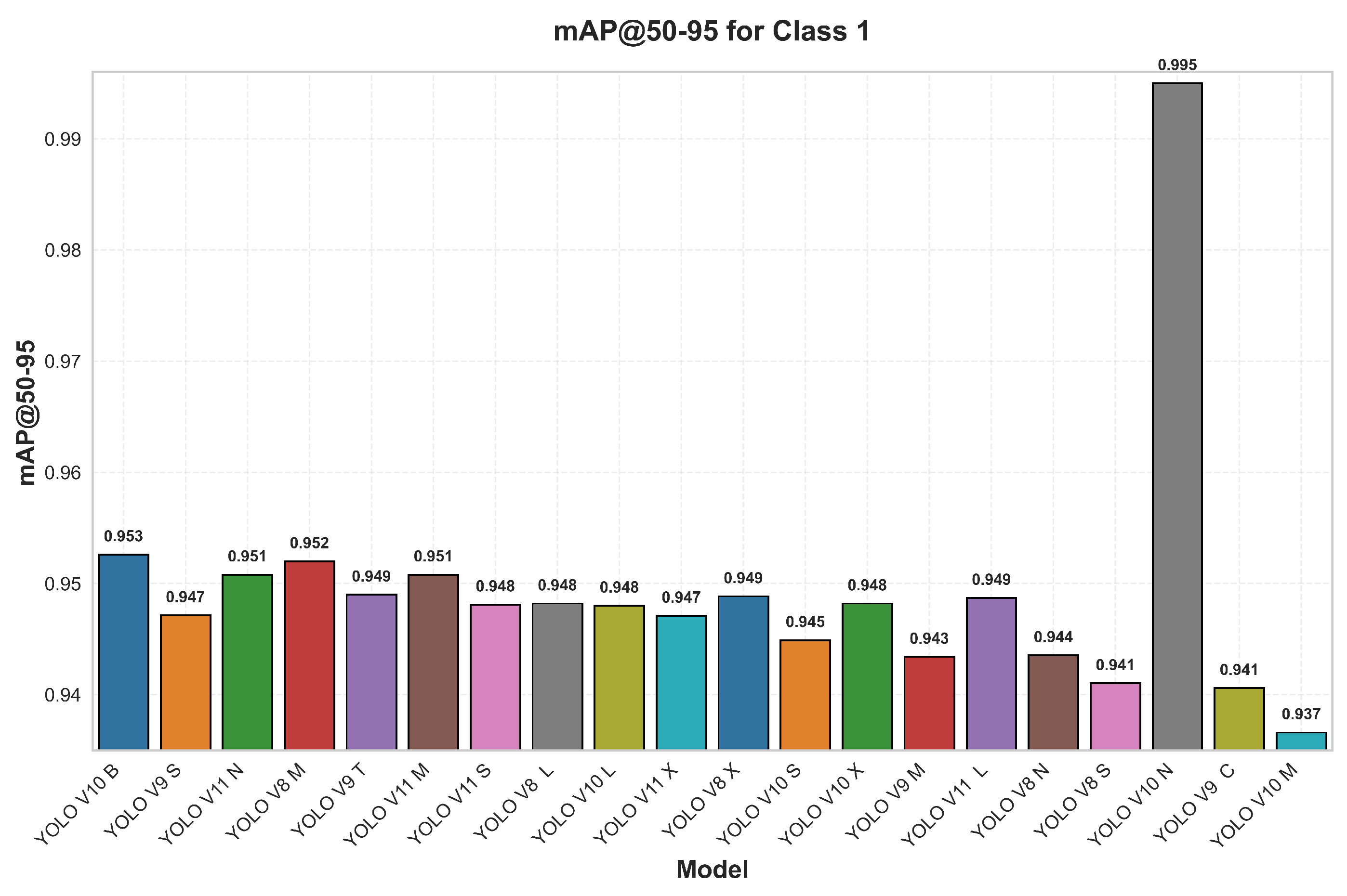 Per-model detection performance for Class 0 (Left Turn). Bars indicate mean Average Precision (mAP@50–95) for each model. Most architectures reach values above 0.94, with YOLOv10B standing out for its strong generalization in visually consistent symbols.