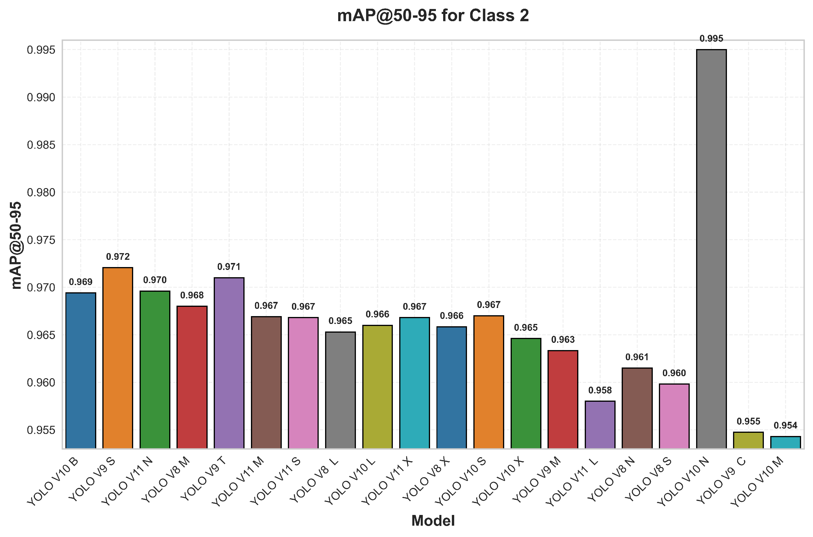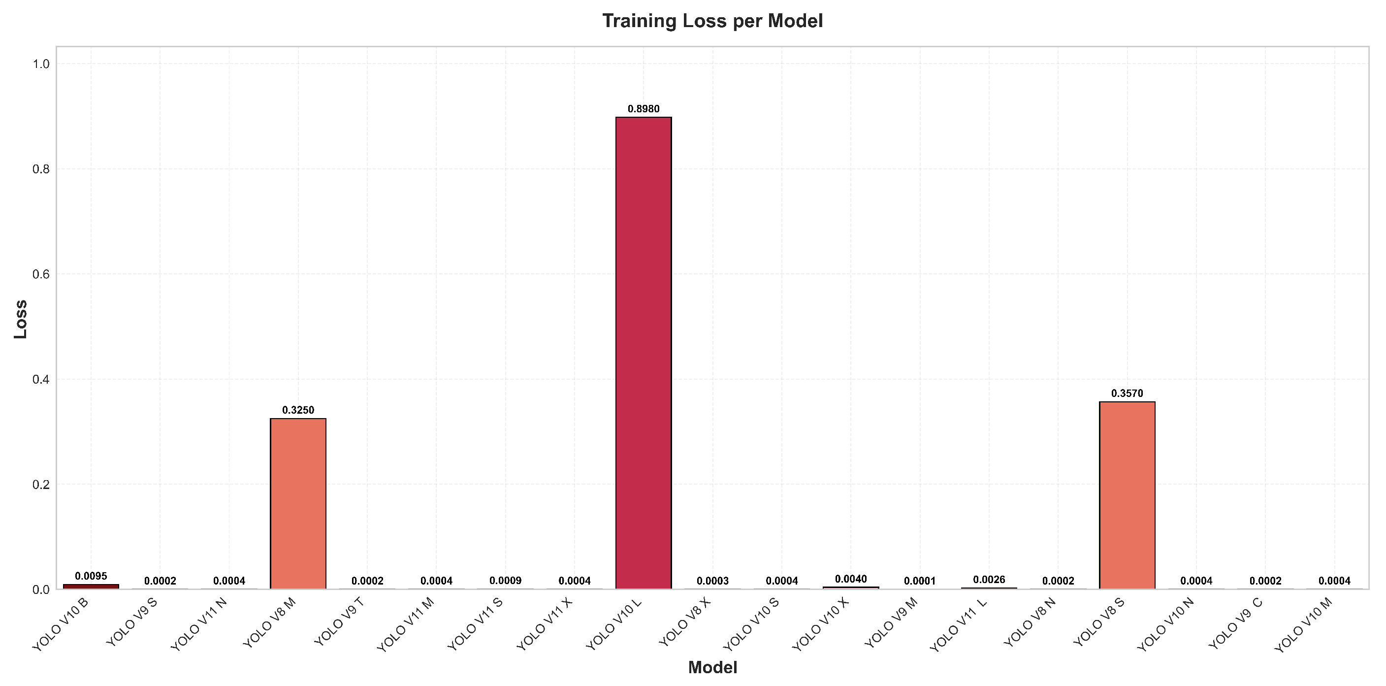 Final training loss achieved after convergence. Lower values indicate smoother optimization and stronger generalization. YOLOv10B and YOLOv9S yield the lowest residual losses, while YOLOv8M and YOLOv10L exhibit higher remaining error, suggesting sensitivity to overfitting in larger parameter spaces.
