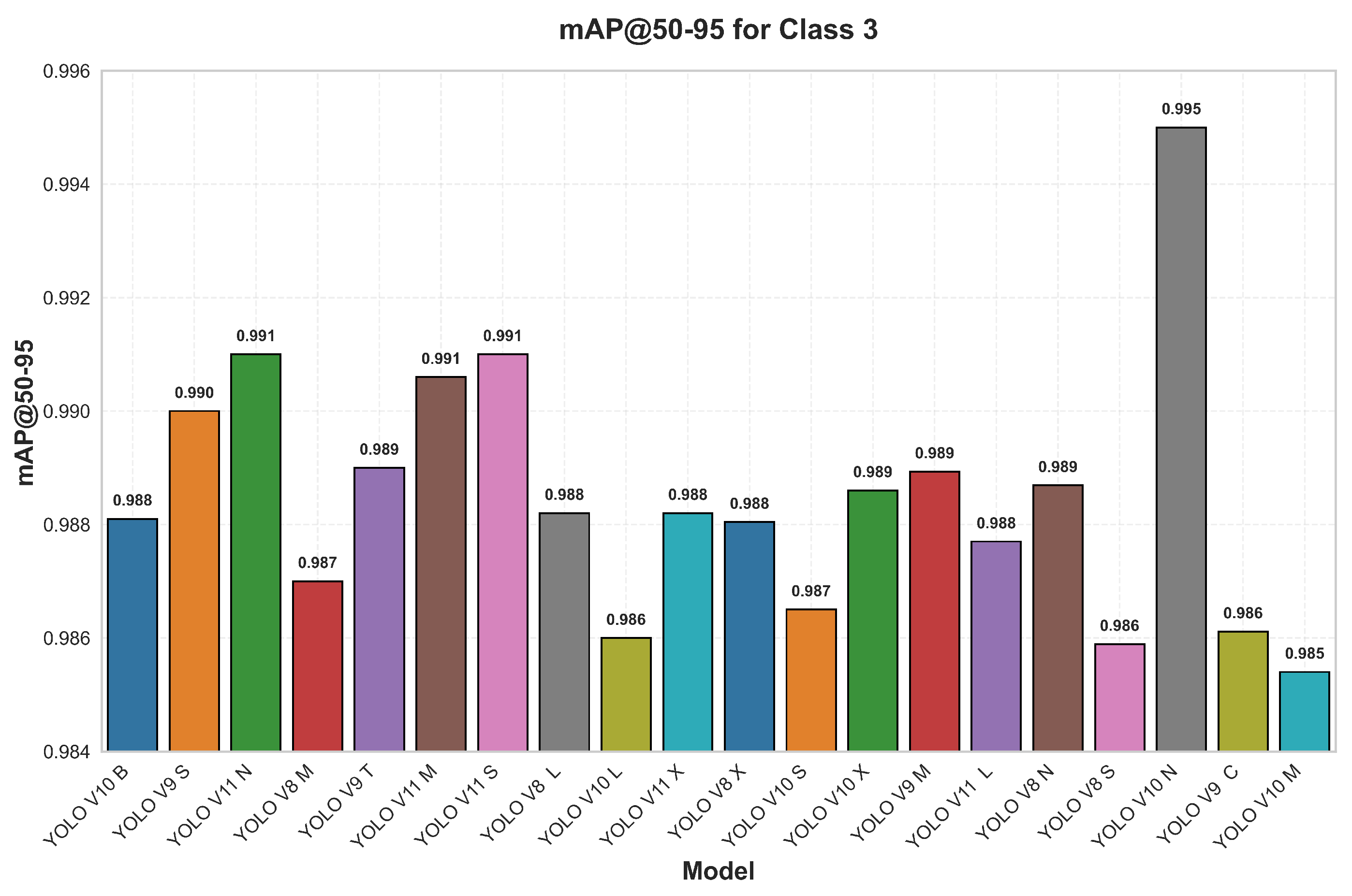 Per-model performance for Class 3 (Dead End). Almost all YOLO versions achieve very high precision, confirming the robustness of detection for signs with distinctive geometry and strong color contrast.
