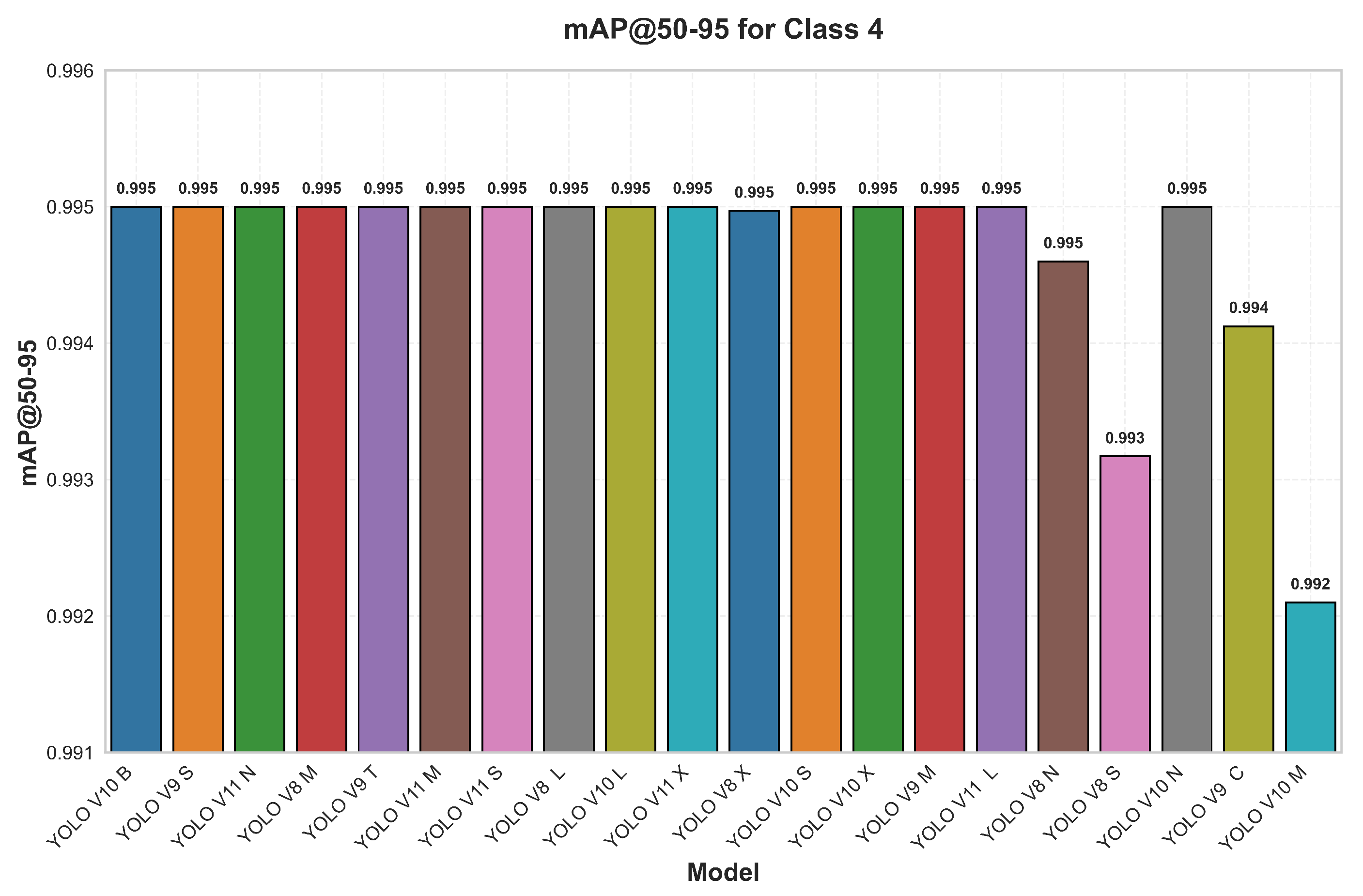 Per-model performance for Class 4 (No Entry). All architectures exhibit high mAP@50–95, typically above 0.97. This strong performance arises from the clear color separation and stable shape of the sign.