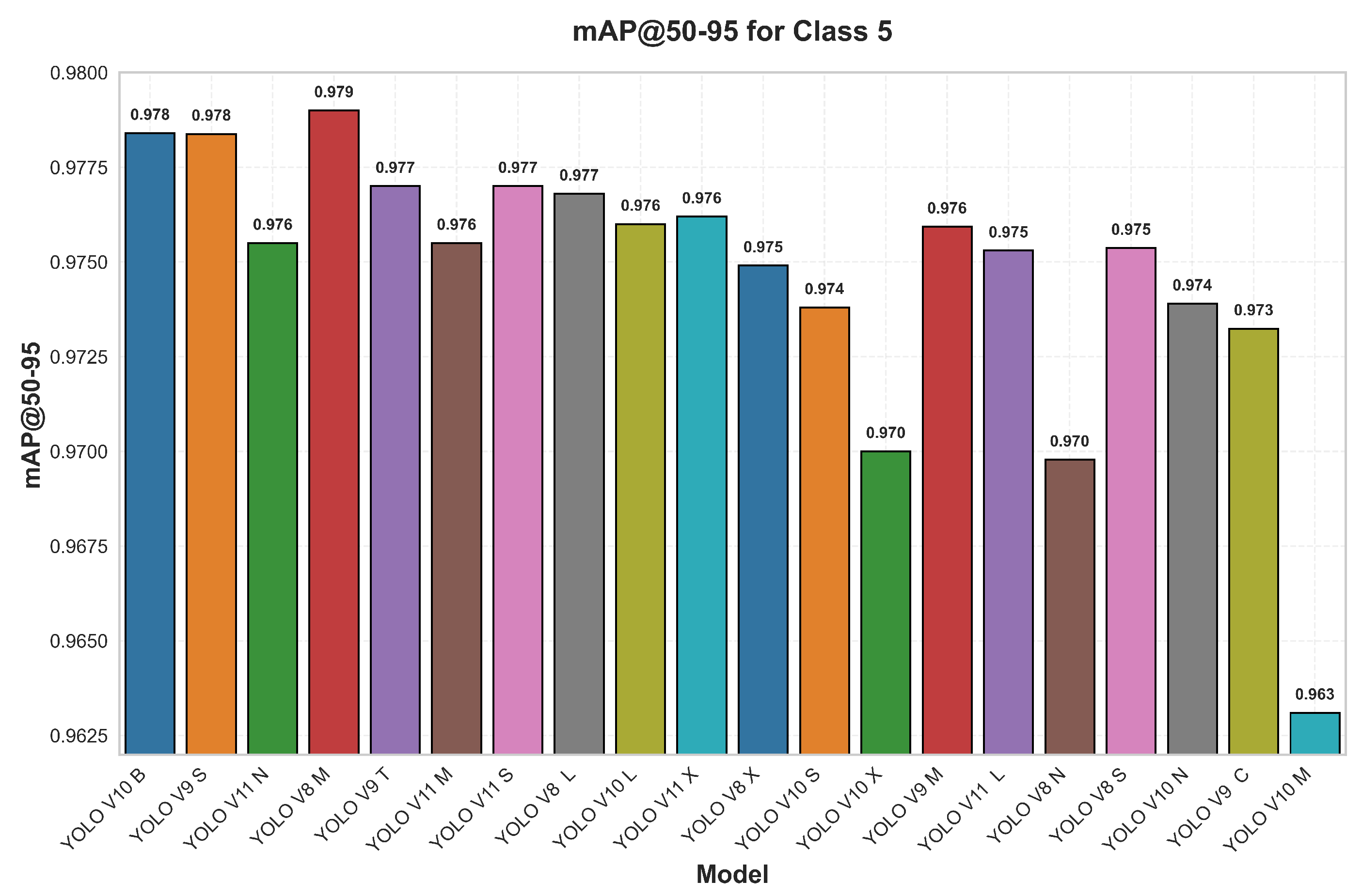 Per-model detection accuracy for Class 5 (Stop). The majority of models reach saturation near 1.0 mAP@50–95, showing that this symbol—with its distinctive red octagon and white text—is easily recognized under various conditions.