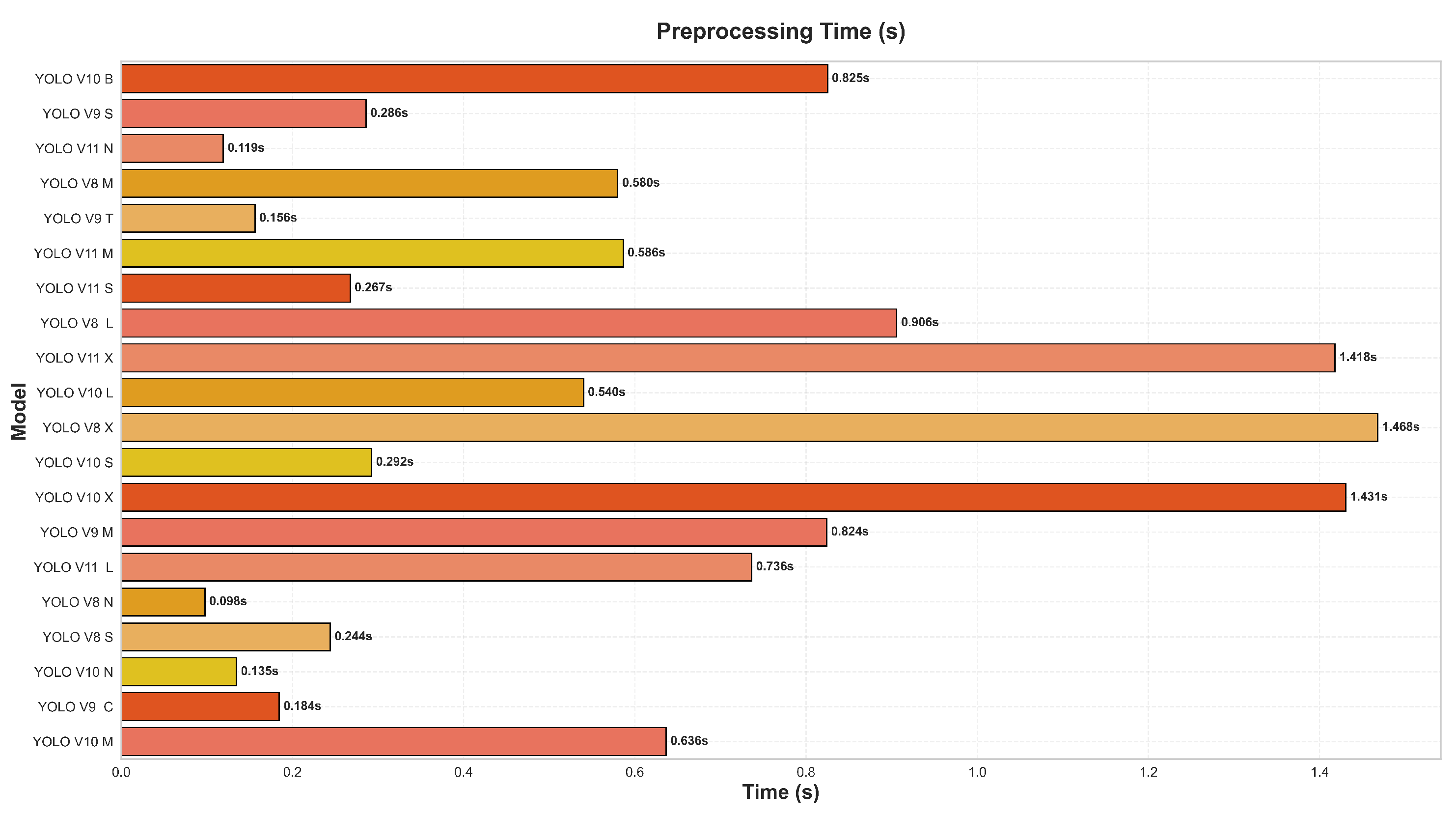Average preprocessing time across YOLOv8–YOLOv11 architectures (ms). This stage includes image normalization, resizing, and data loading operations before inference. Preprocessing time remains below 0.6 s for the compact models YOLOv11N and YOLOv8M, while it goes above 1.3 s for heavier versions such as YOLOv10B and YOLOv8X due to the overhead introduced by tensor reshaping.