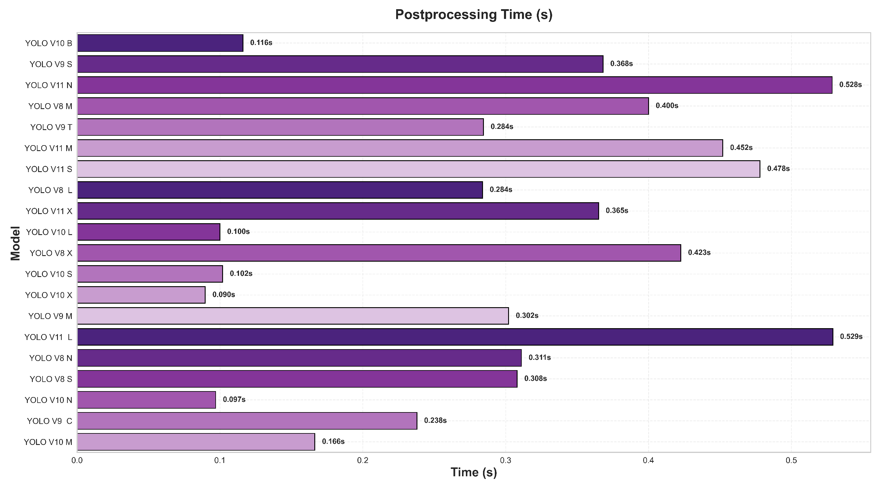 Postprocessing time distribution per model (milliseconds). This phase includes confidence filtering and non-maximum suppression (NMS) to refine bounding boxes. Smaller models such as YOLOv10N and YOLOv8S remain under 0.25 s, while larger ones like YOLOv11X and YOLOv9S approach 0.52 s. Overall, postprocessing contributes minimally to total delay compared with inference time.