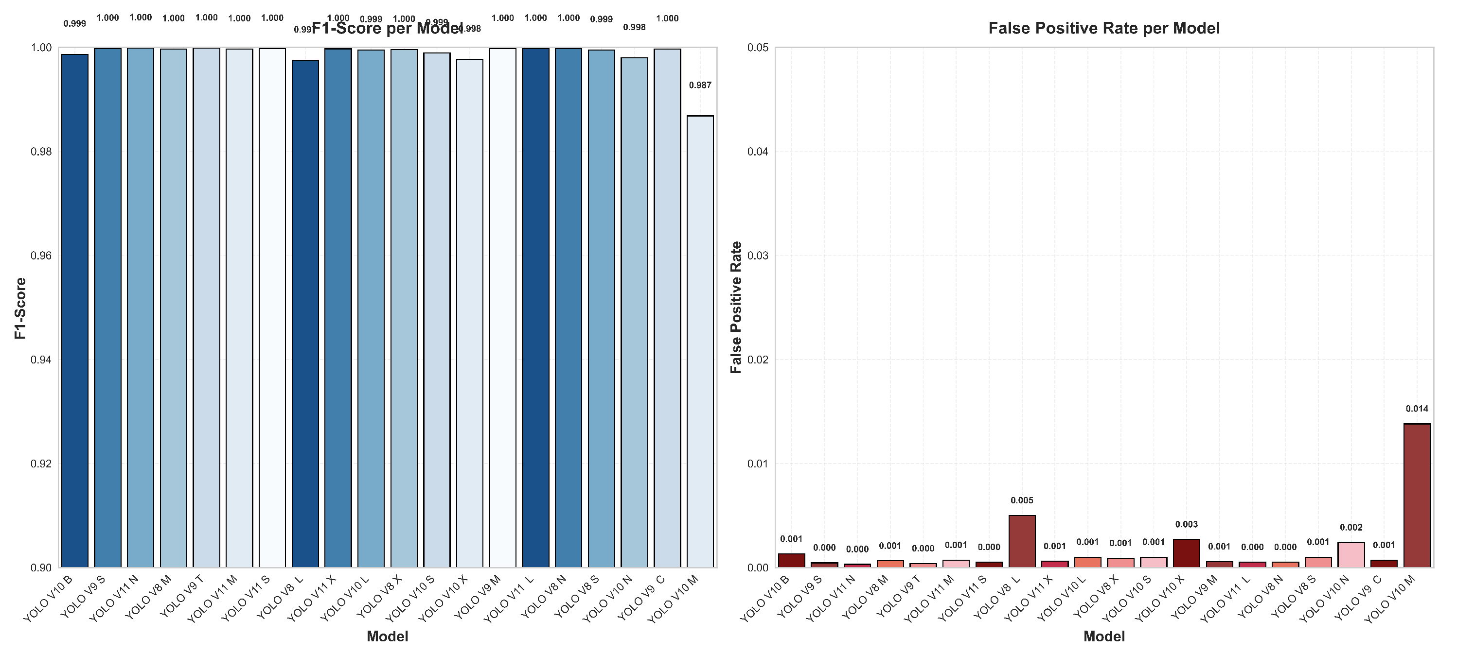 Complementary metrics describing detection reliability. Left: the F1-score for each model, which balances precision and recall. Right: false-positive rate per model. All tested YOLO architectures achieve F1-scores over 0.99 and false-positive rates below 0.015. This demonstrates uniform detection performance across versions, suggesting that even compact models maintain robustness under the same evaluation settings.