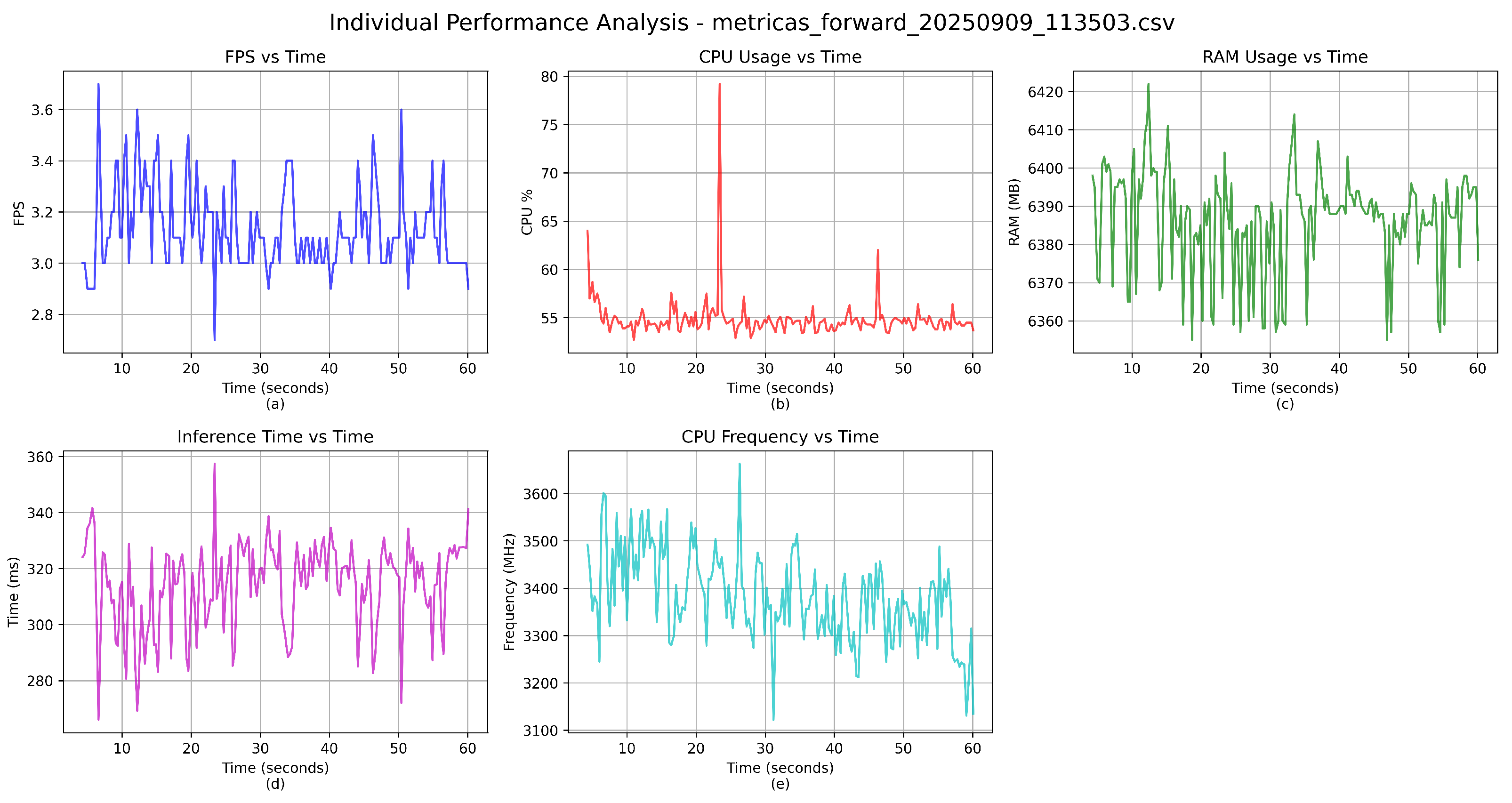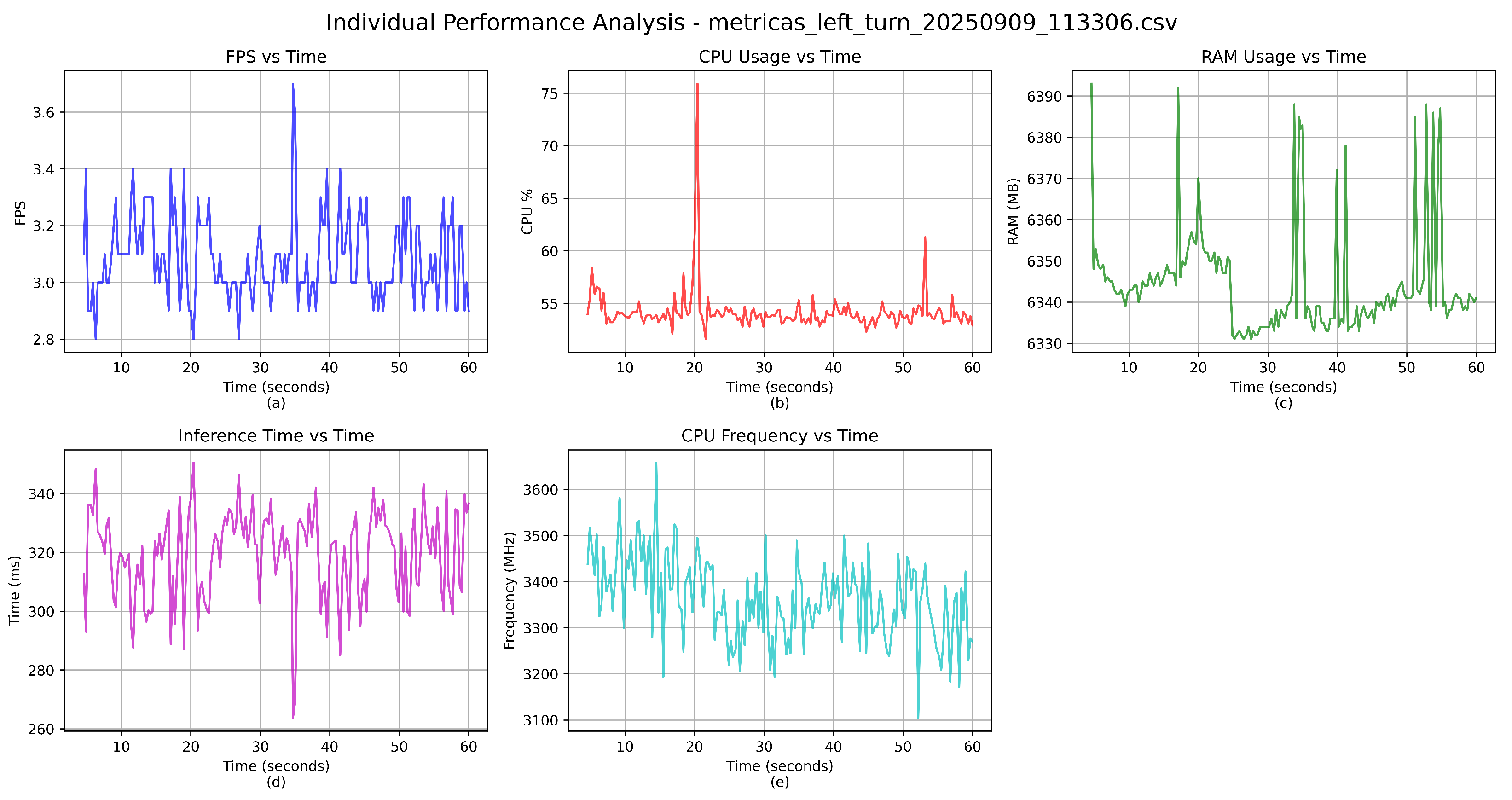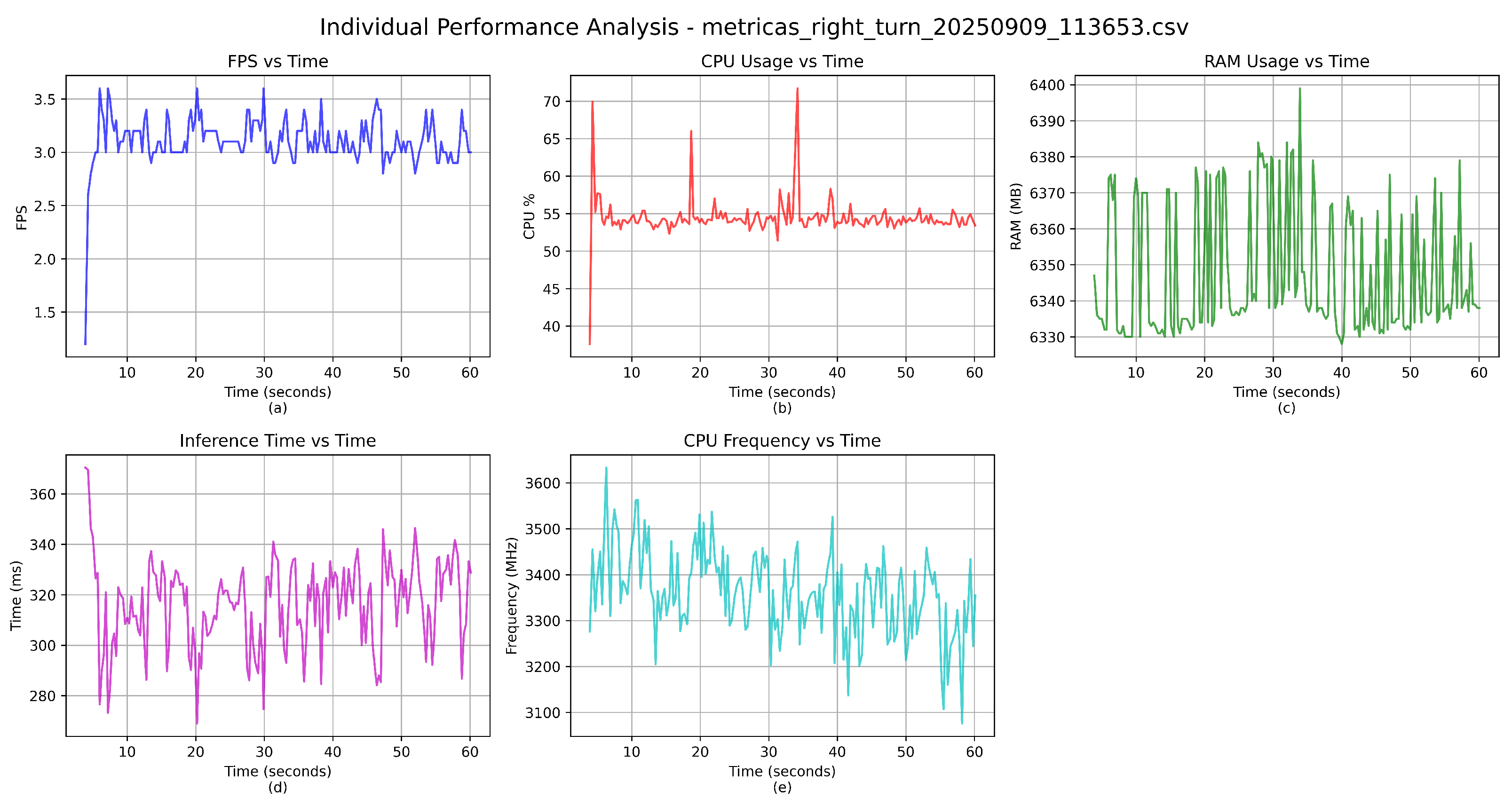Performance metrics during detection of the “Right Turn” traffic sign: (a) FPS vs. Time, (b) CPU Usage vs. Time, (c) RAM Usage vs. Time, (d) Inference Time vs. Time, (e) CPU Frequency vs. Time. The system maintained real-time detection with high reliability and hardware stability.