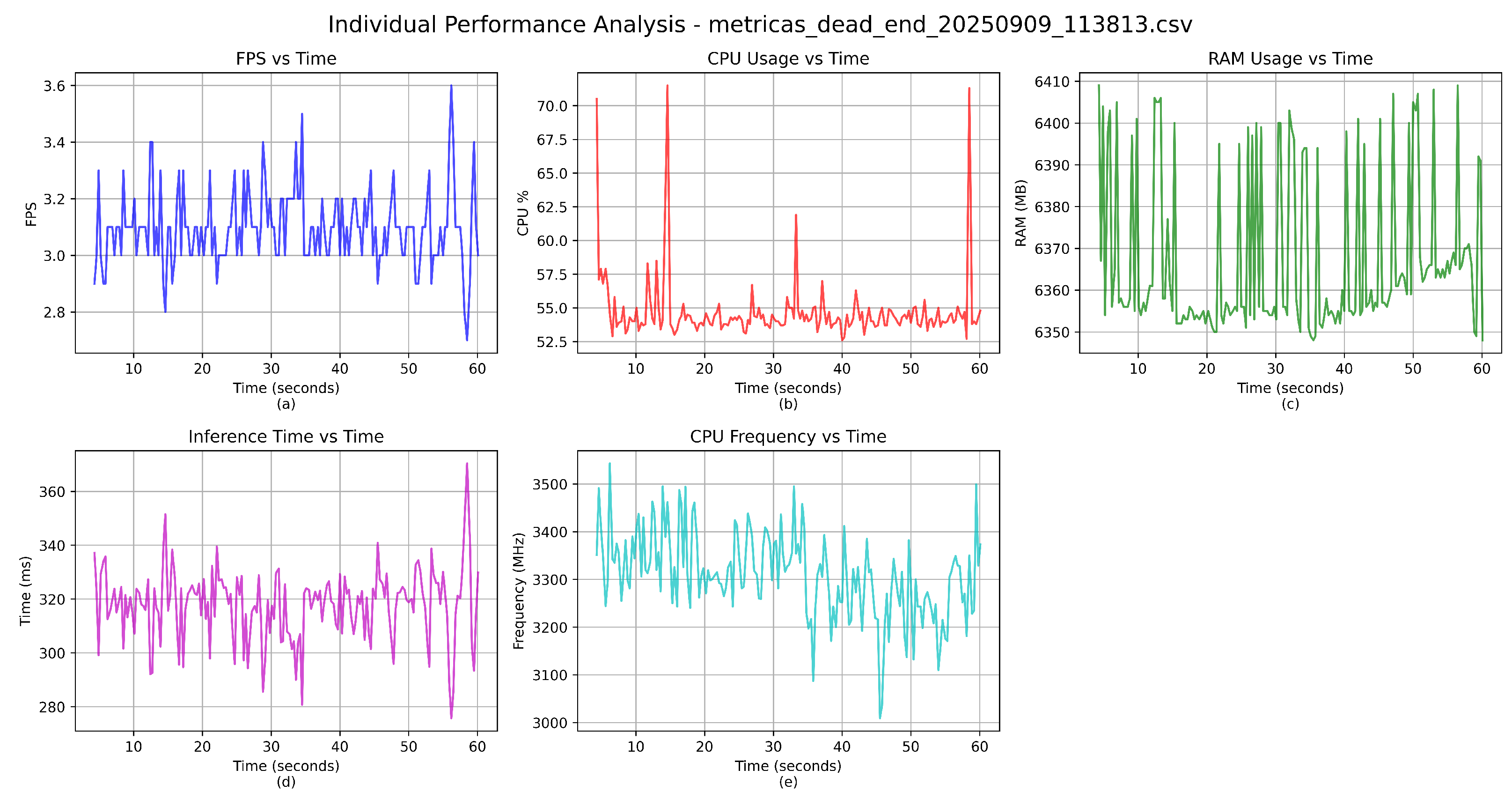 Performance metrics during detection of the “Dead End” traffic sign: (a) FPS vs. Time, (b) CPU Usage vs. Time, (c) RAM Usage vs. Time, (d) Inference Time vs. Time, (e) CPU Frequency vs. Time. Stable hardware utilization and consistent detection were observed.