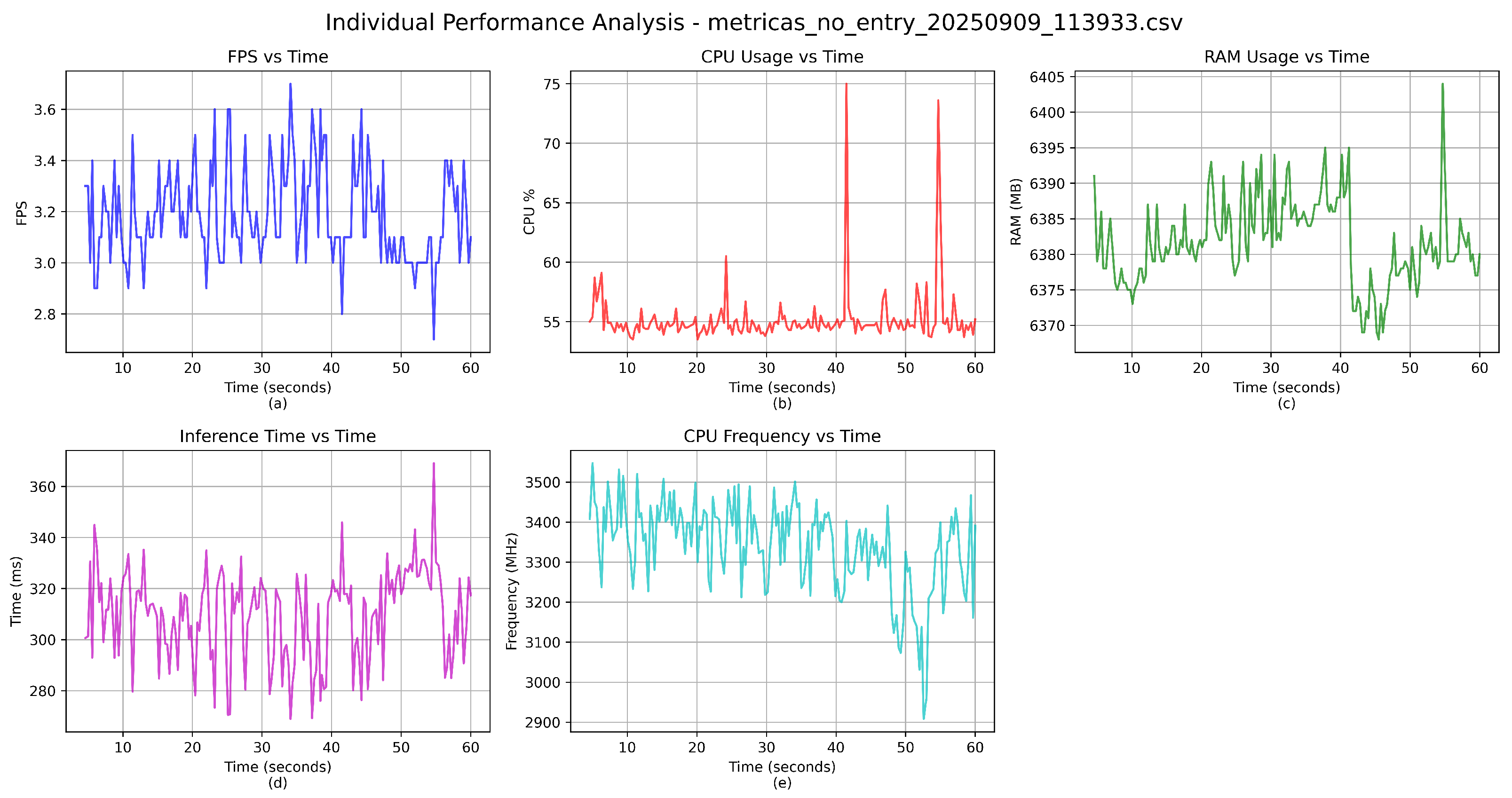 Performance metrics during detection of the “No Entry” traffic sign: (a) FPS vs. Time, (b) CPU Usage vs. Time, (c) RAM Usage vs. Time, (d) Inference Time vs. Time, (e) CPU Frequency vs. Time. Results confirm stable inference and precise classification despite visual similarity to other classes.