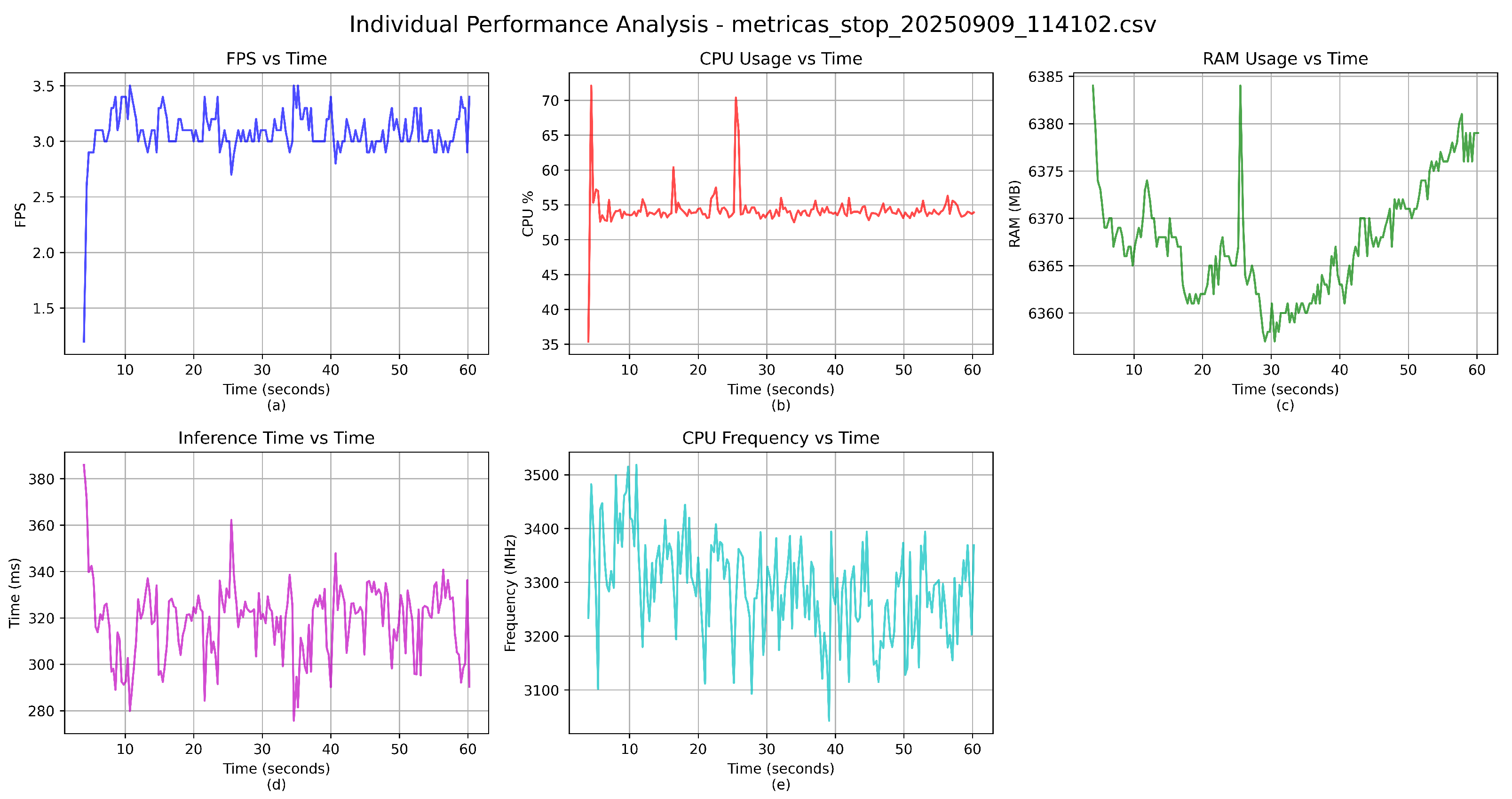 Performance metrics during detection of the “Stop” traffic sign: (a) FPS vs. Time, (b) CPU Usage vs. Time, (c) RAM Usage vs. Time, (d) Inference Time vs. Time, (e) CPU Frequency vs. Time. Results show consistent behavior and perfect classification accuracy, affirming the model’s capability to detect highly distinctive signs.