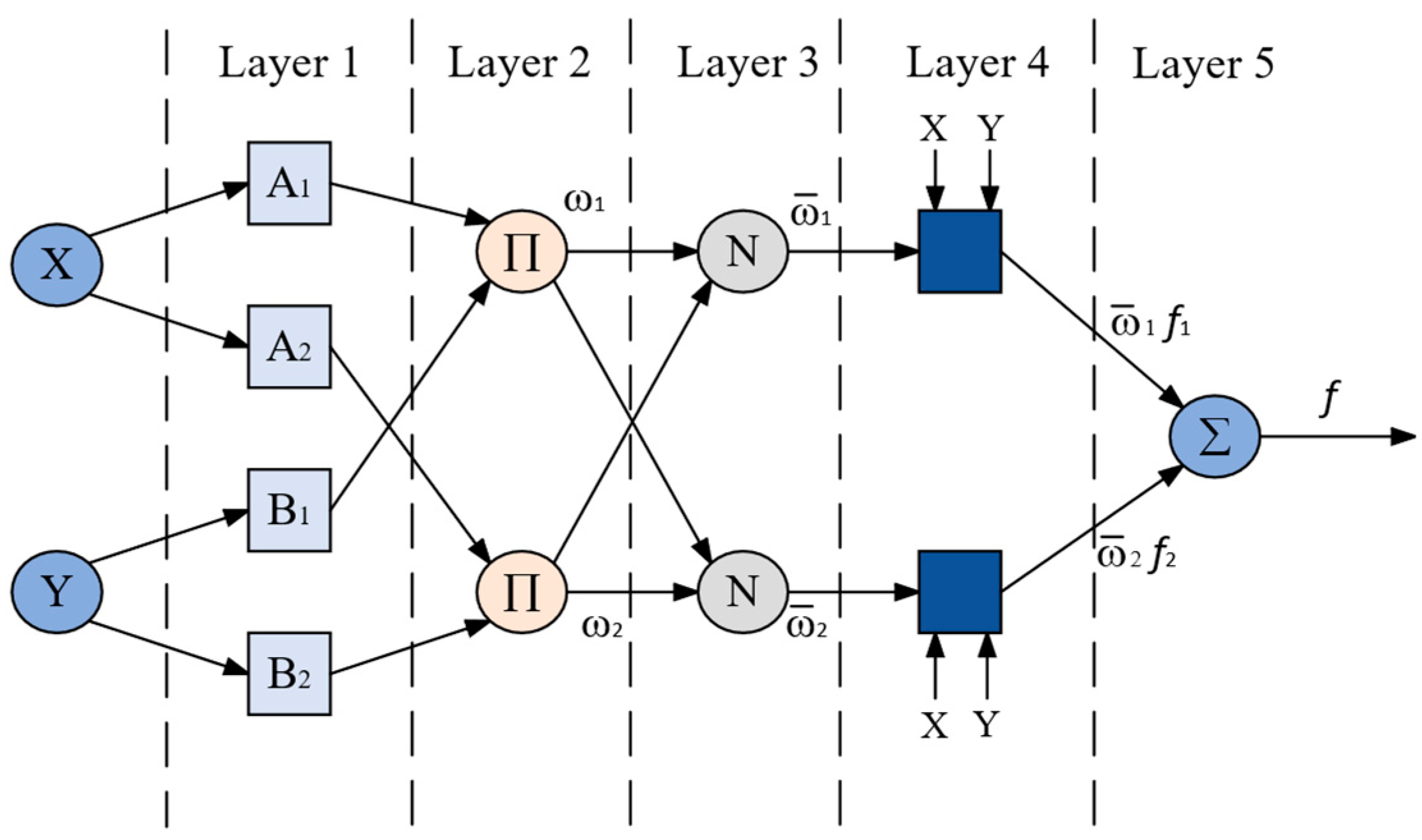 - Normalization layer: normalizes firing strengths to obtain weighting coefficients.