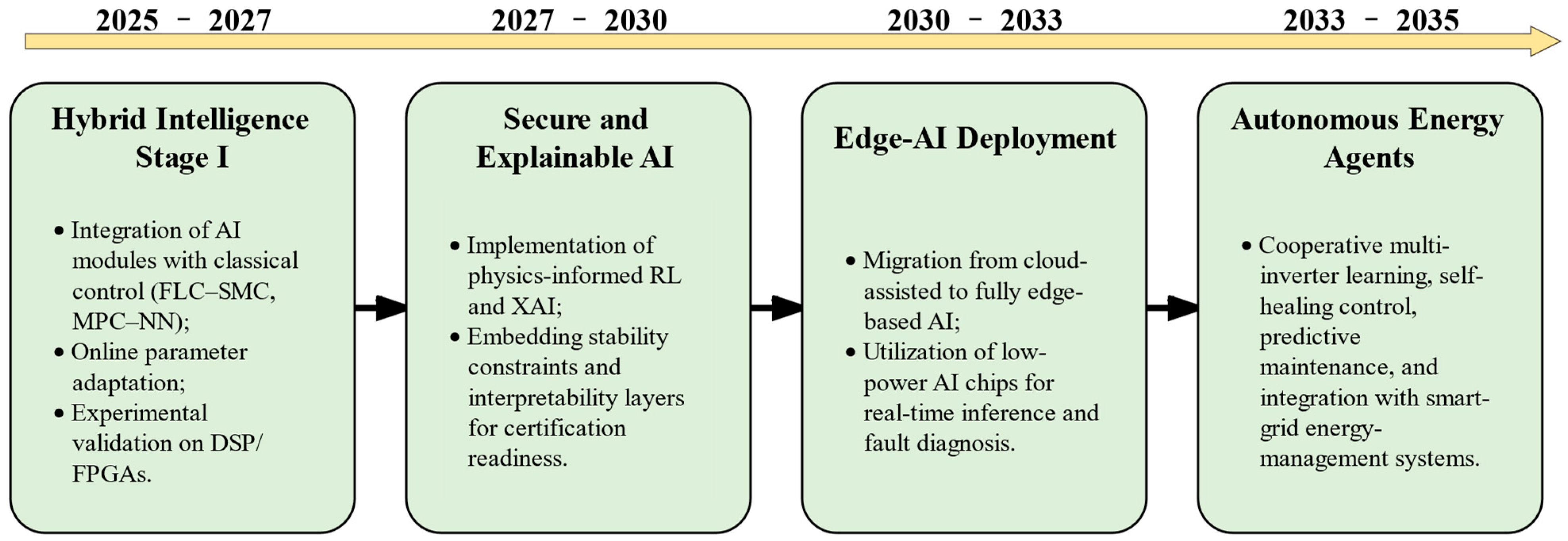 - Explainable AI (XAI) for control: Integrating interpretability methods such as sensitivity analysis, feature attribution, and surrogate modeling can reveal how input variables (voltage, current, irradiance) influence AI decisions, enhancing understanding and trust in AI controllers.
