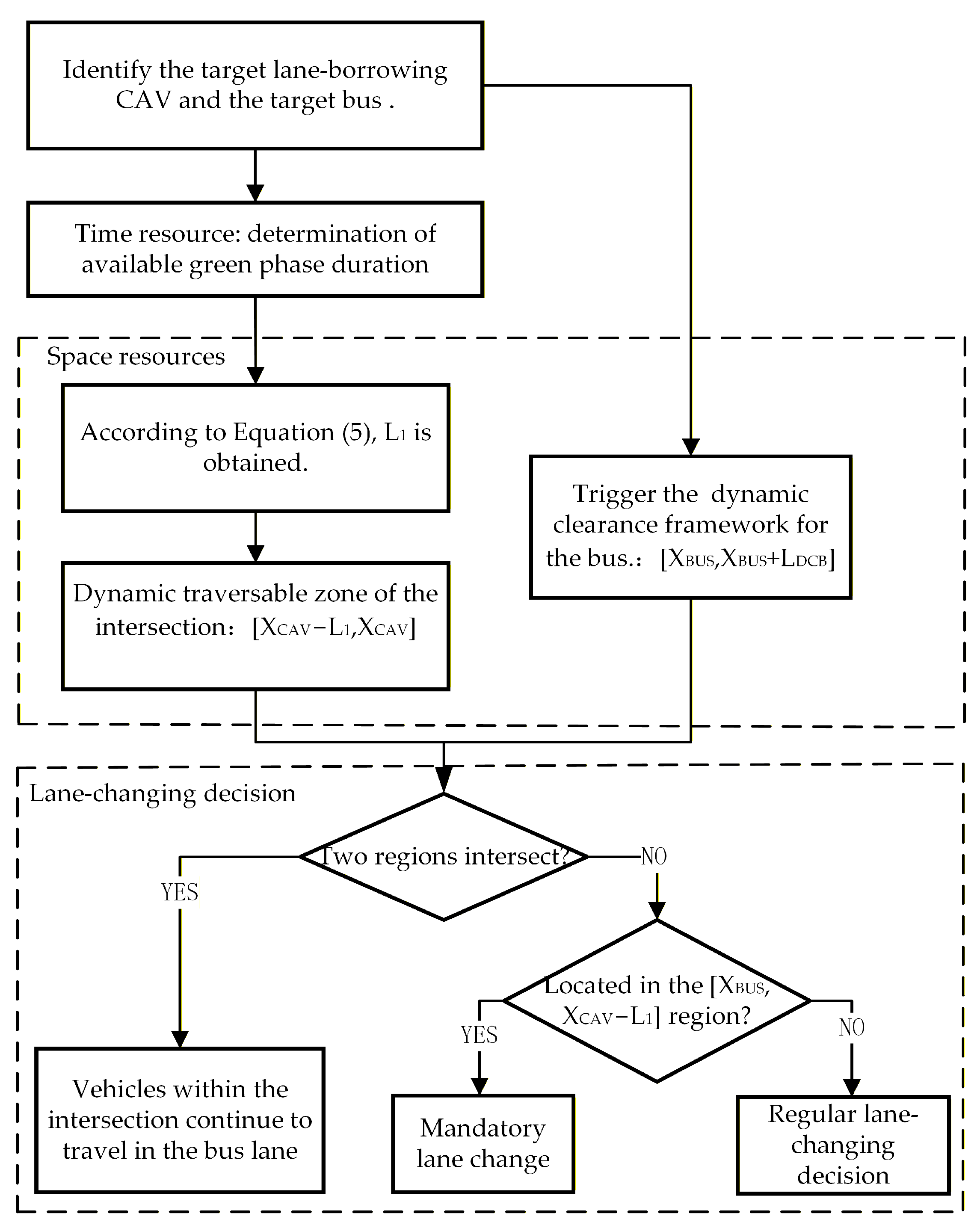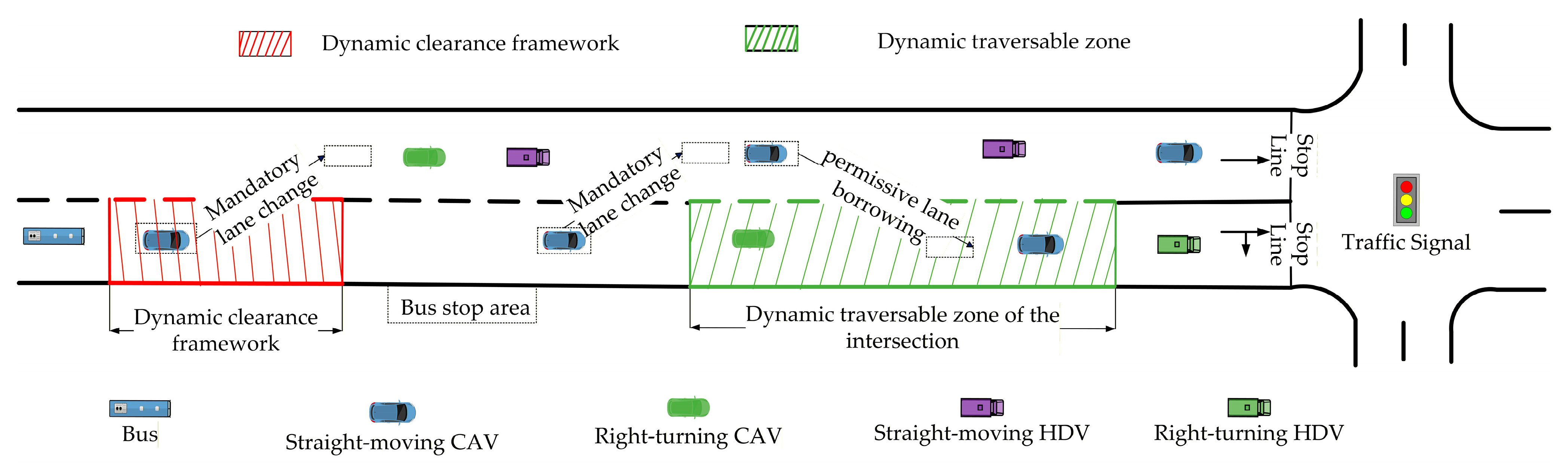 - CAVs proceeding straight or turning right fully comply with the lane-borrowing strategy after transitioning to the bus lane and determine whether to continue utilizing the lane or return to their original lane based on control strategies at the road segment and intersection;