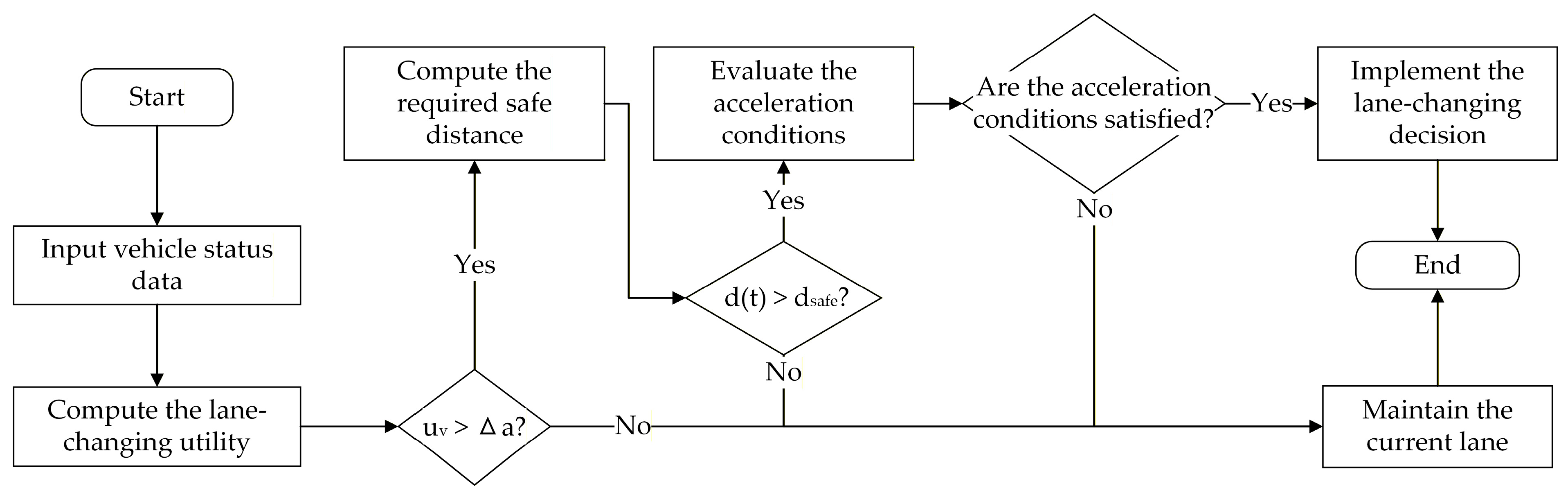 - Pan, Y.; Wang, S. Improved Weighted Mobil Decision Model for Autonomous Lane Change in Networked Autopilot Environment. J. Chongqing Jiaotong Univ. (Nat. Sci.) 2021, 40, 46–52+101. [Google Scholar] [CrossRef]