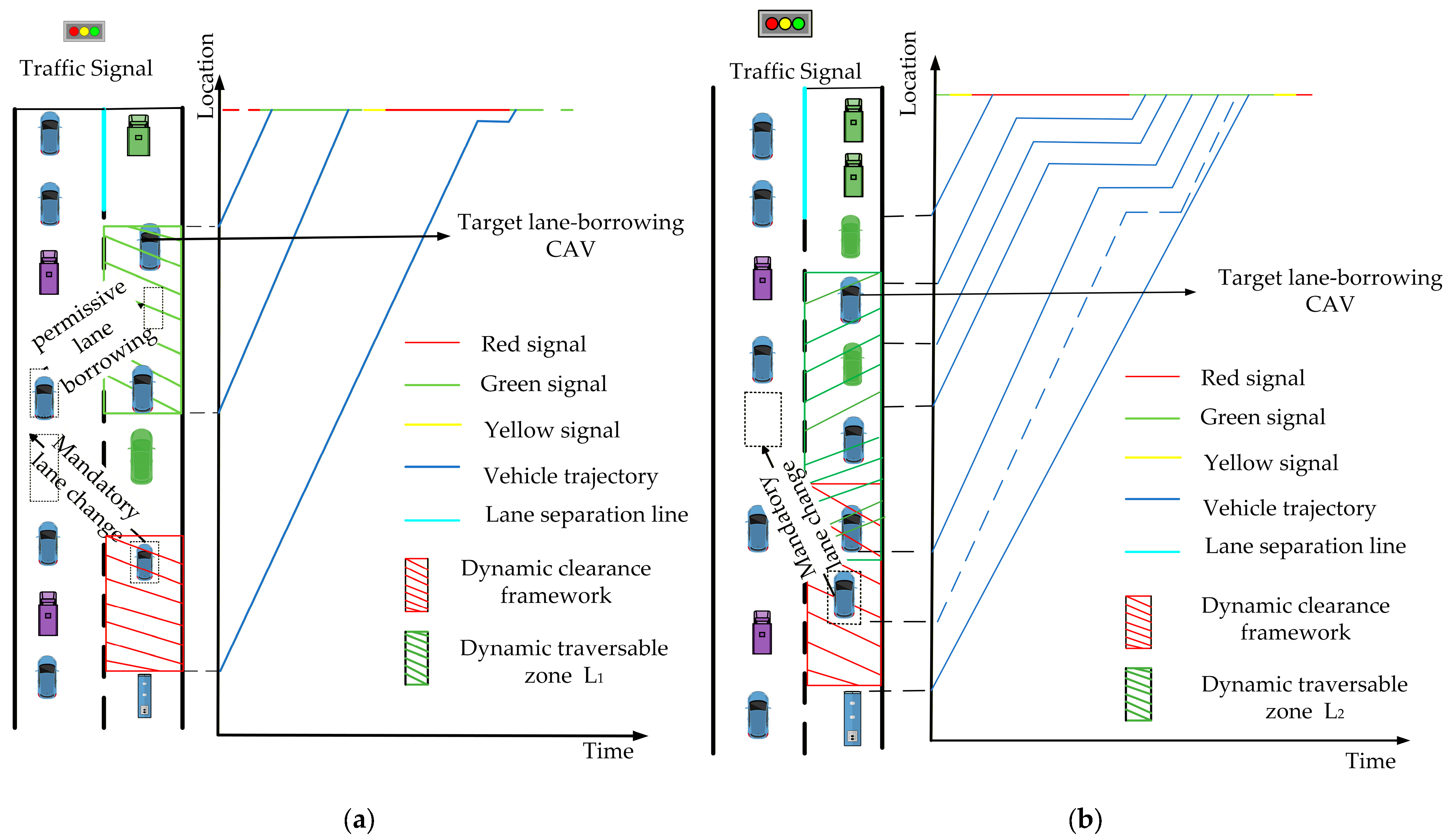 2.2. Fundamental Assumptions and Lane-Borrowing Regulations for Vehicles