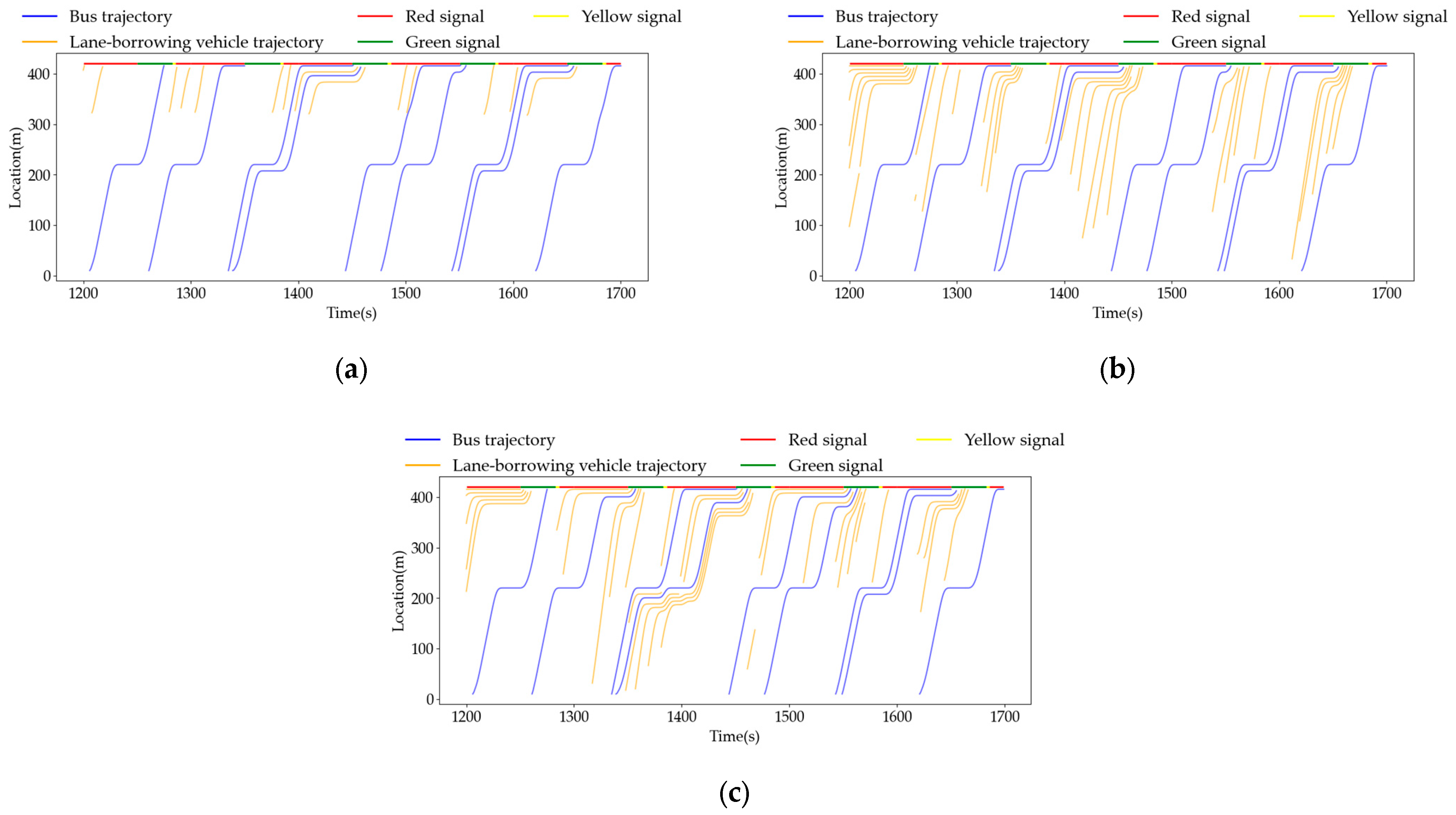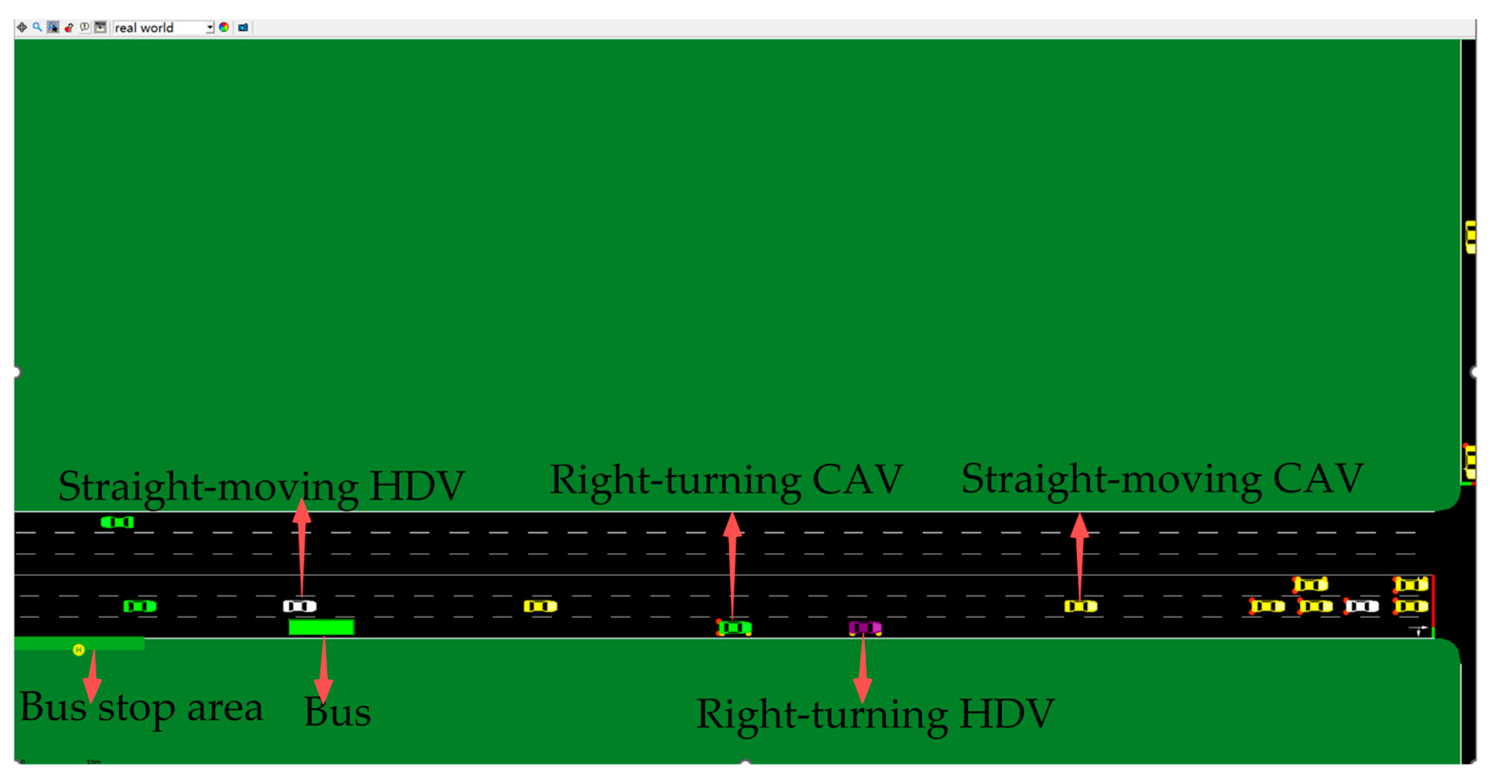 - Scenario 3: When the target CAV and the target bus arrive, the traffic light is red. All straight-driving lane-borrowing vehicles, including the target CAV, located in front of the target bus are mandatorily required to change lanes back to the regular lane.