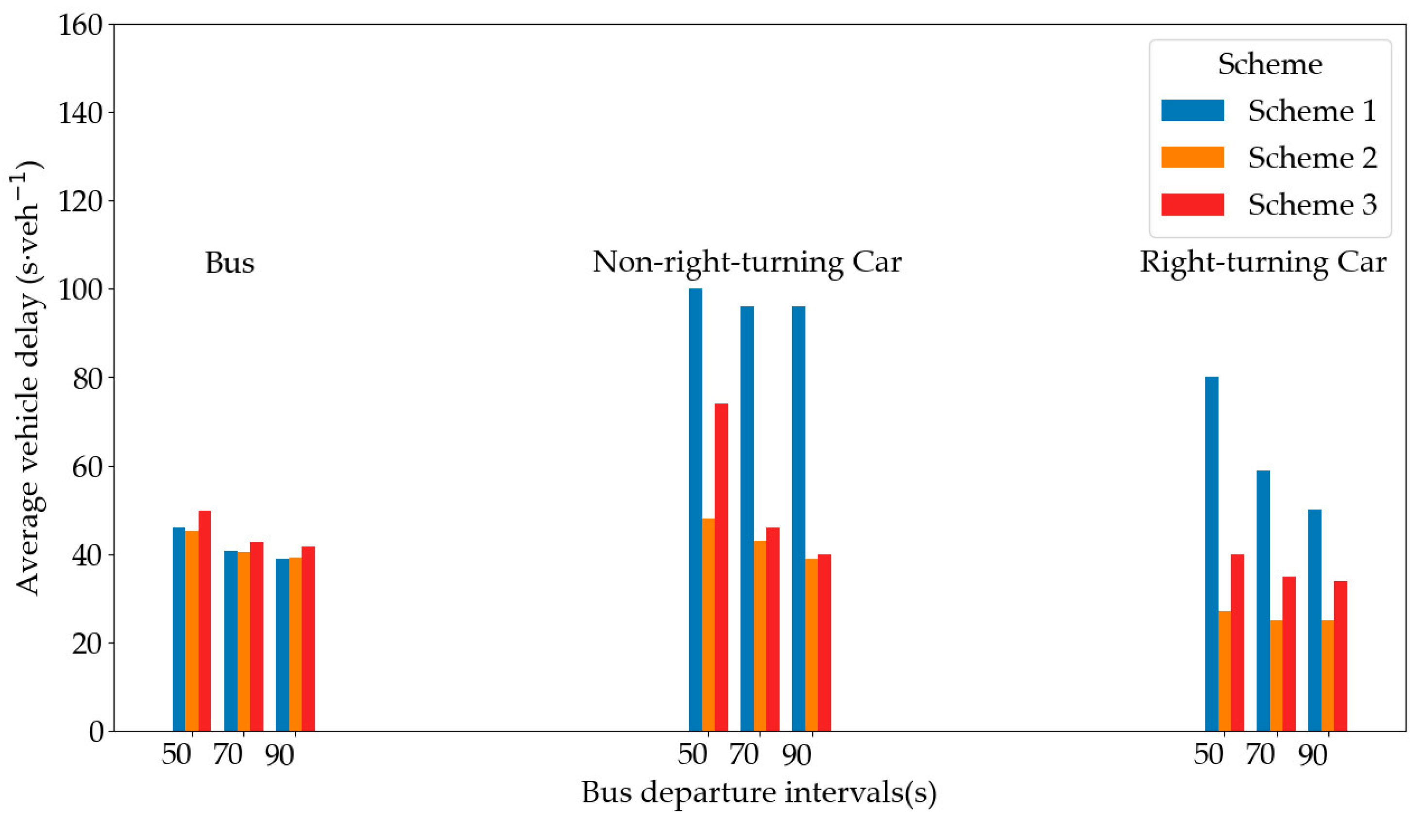 | Average vehicle delay of non-right-turning cars (s∙veh−1) | 48 ± 2 | 100 ± 4 | 36 ± 1 | 48 ± 2 | 42 ± 2 | 74 ± 3 |