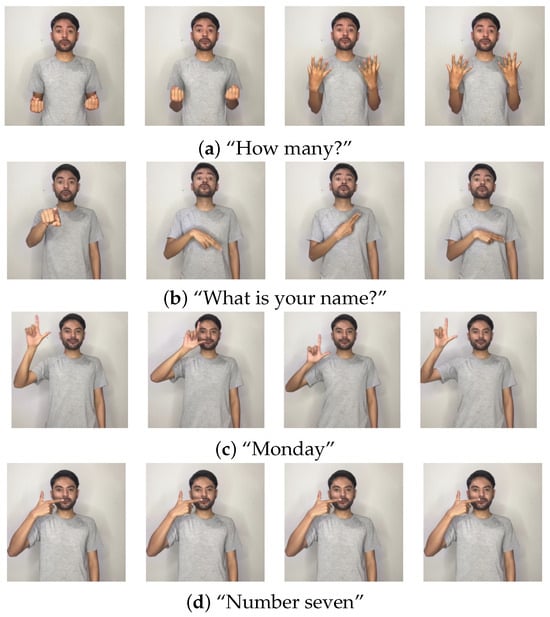 Figure 2 shows four representative signs in the Mexican Sign Language (MSL). Each row corresponds to one sign, and the four images display consecutive frames (left–right) from start to finish.