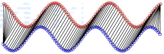 Example of dynamic time warping (DTW) sequence alignment. The red and blue curves denote the two time series being aligned. Unlike Euclidean distance, DTW allows nonlinear temporal alignment between the sequences. The black connecting paths illustrate how DTW warps the time axis to align similar patterns across different time positions, producing an adaptive alignment rather than a fixed point-to-point comparison.