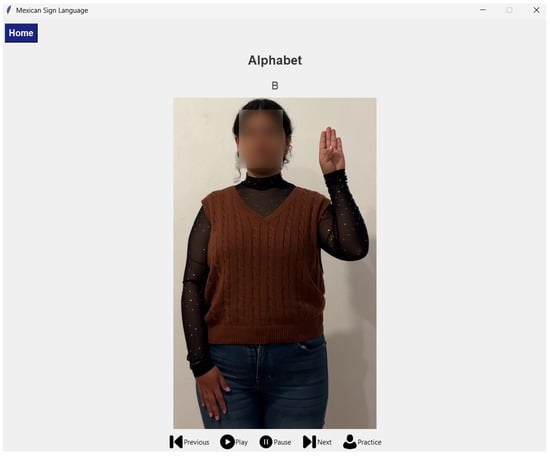 Upon selecting a lesson, the practice window opens as shown in Figure 9. In the upper-left corner, a home button allows returning to the main menu. The central area displays the reference video, above it, two labels appear: the lesson title and the sign name. The bottom strip contains five control buttons: Previous, Play, Pause, Next, and Practice. The Practice button initiates camera capture and evaluation.