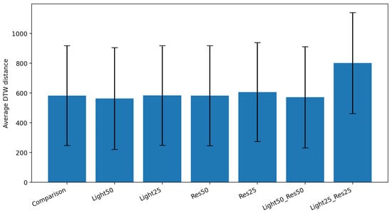 To visualize the overall impact of lighting and resolution, Figure 12 summarizes the average DTW distance by condition (error bars = ±1 SD).