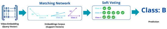 For similarity-based classification, we implemented a Matching Network (MN) [], comparing query embeddings against a set of supports using cosine distance and soft voting as shown in Figure 14. The support vectors are those that compose the reference videos. Each of these patch embeddings determines the class to which it belongs. The query vectors are those that need to be classified. The process for classifying patch video embeddings involves comparing the cosine distance between each patch of the query vector and each support vector, with the one yielding the smallest distance being set as the prediction for that patch. Due to every video sample having N video-empedding patches, the process is repeated in all the patches that belong to the video, at the same time each prediction is registered to obtain the class voted the most, implementing a soft voting strategic, this class is the one that is set as the preliminar class predicted.