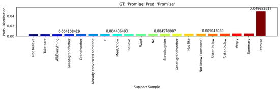 Softmax probability distribution over all support signs for the query sign “Promise” using the Qwen2.5VL + MN embedding baseline.
