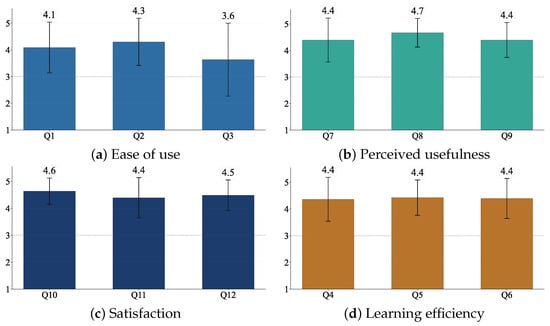 Figure 18 summarizes the distribution of responses per category (subfigures a–d). The responses were clearly concentrated in the higher range (4–5), suggesting favorable perceptions of the system in all dimensions.