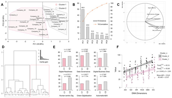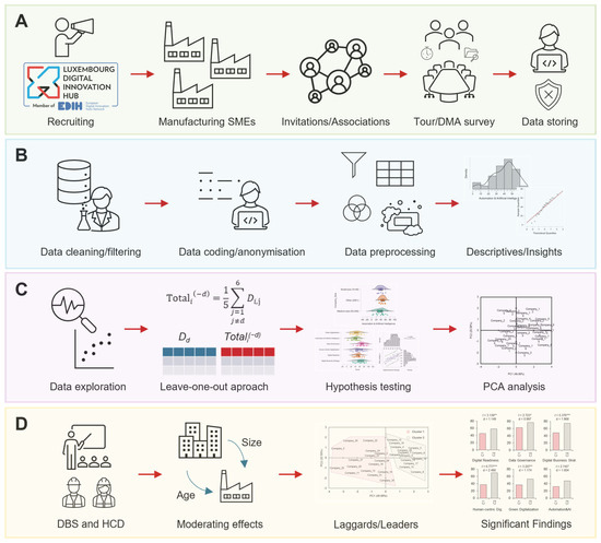 The study implements a four-module research protocol (Figure 1). Module A operationalises the DMAT through firm-level data collection. This stage encompasses SME recruitment, invitation to associations, on-site tours, and the administration of structured surveys, followed by secure data storage. Module B addresses data integrity and preparation, comprising cleaning, coding, and anonymisation, as well as preprocessing and descriptive statistics. Module C focuses on analytical procedures, including exploratory analysis, a leave-one-out approach, and hypothesis testing to identify the most influential predictors. Subsequently, PCA–HCPC (Principal Component Analysis with Hierarchical Clustering on Principal Components) is applied to delineate distinct SME cluster profiles. Module D extends the analysis by interpreting statistically significant results, assessing moderating effects, differentiating between digital Leaders and Laggards, and evaluating the relative importance of DMA dimensions across clusters.