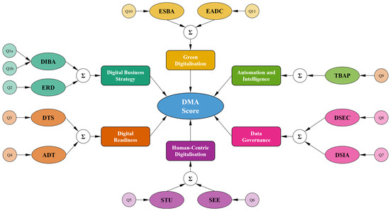 The DMAT survey [67,68] comprised a comprehensive set of questions grouped under the six main dimensions (Figure 2): (1) Digital Strategy, (2) Digital Readiness, (3) Digital Skills, (4) Data Management, (5) Automation/AI, and (6) Green Digitalisation. In total, the survey comprised 11 questions covering DMA dimensions, primarily in a multiple-choice format, where each choice corresponded to a specific maturity level or practice. Companies also provided basic profile information (sector, number of employees, annual turnover range, and respondent’s role) to allow analysis by size class or industry segment. No names or uniquely identifying details of companies were recorded in the dataset—instead, each respondent was assigned an anonymous code.