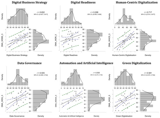 Strategy and human-centric capabilities often function as “meta-capabilities” that shape prioritisation, change readiness, and absorptive capacity. In contrast, technical and sustainability pillars typically realise their value once these foundations are in place [60]. To avoid compositional inflation when relating a dimension to the overall DMA score, we introduce leave-one-out correlation (LOOC) analysis to reduce bias in assessing predictors of DMA by excluding the focal dimension.
