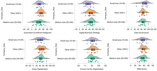 Within firms, capabilities are unlikely to develop uniformly. We expect DG and DBS to lead (reflecting data foundations and strategic alignment), and AAI to lag (given the weak adoption of advanced technologies) due to complexity, lack of staff and resource constraints that often hold back smaller firms [63]. To test these patterns, we treat the six DMAT dimensions as repeated measures within the sample, allowing us to compare whether specific dimensions advanced more than others or remained underdeveloped.