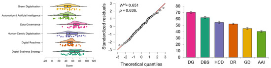 To test whether specific dimensions systematically lag or lead, we performed a repeated-measures ANOVA treating the dimensions as a within-subject factor. This approach leverages the paired design, as each enterprise contributes scores for all dimensions. Assumptions were verified using Mauchly’s test of sphericity, with the Greenhouse–Geisser correction applied if violated. QQ-plots of standardised residuals were inspected to confirm normality. Post hoc contrasts between dimension means were performed with Holm–Bonferroni correction. Effect sizes were reported as partial η2 for omnibus tests and Cohen’s d for pairwise comparisons. This analysis examines whether baseline maturity systematically varies across conceptual domains and quantifies the magnitude of such differences.